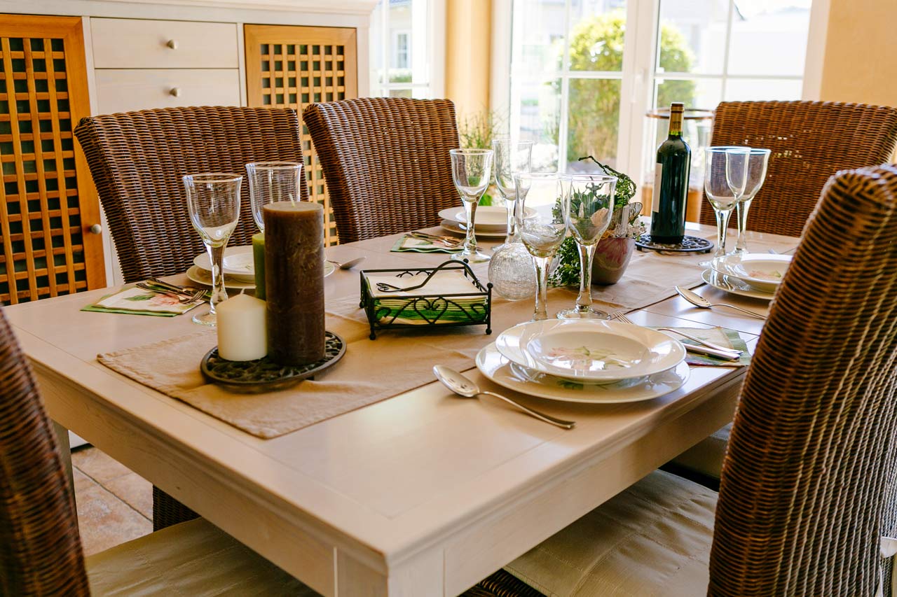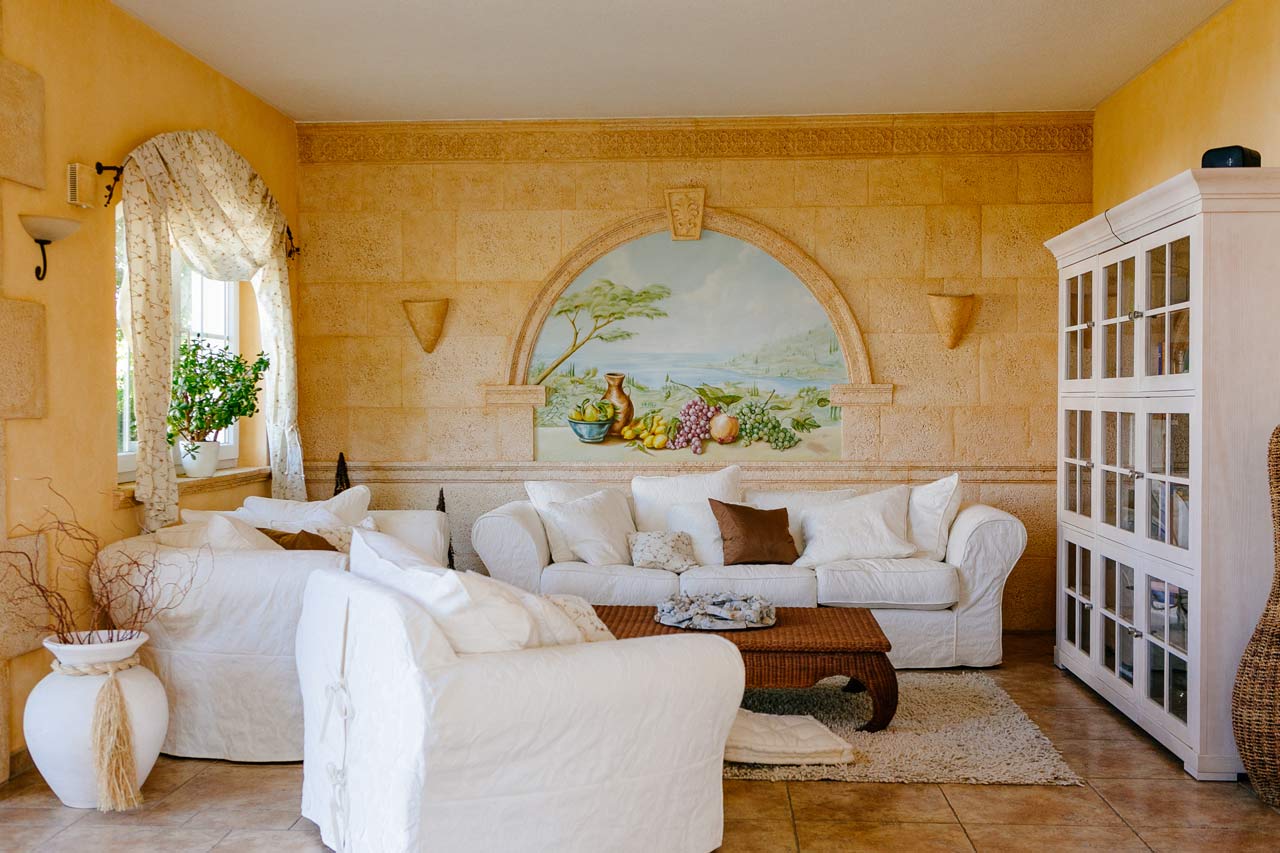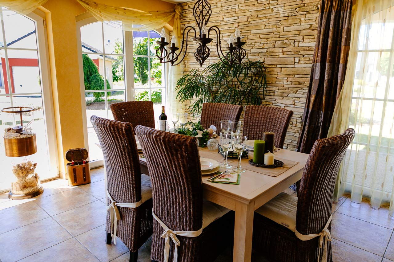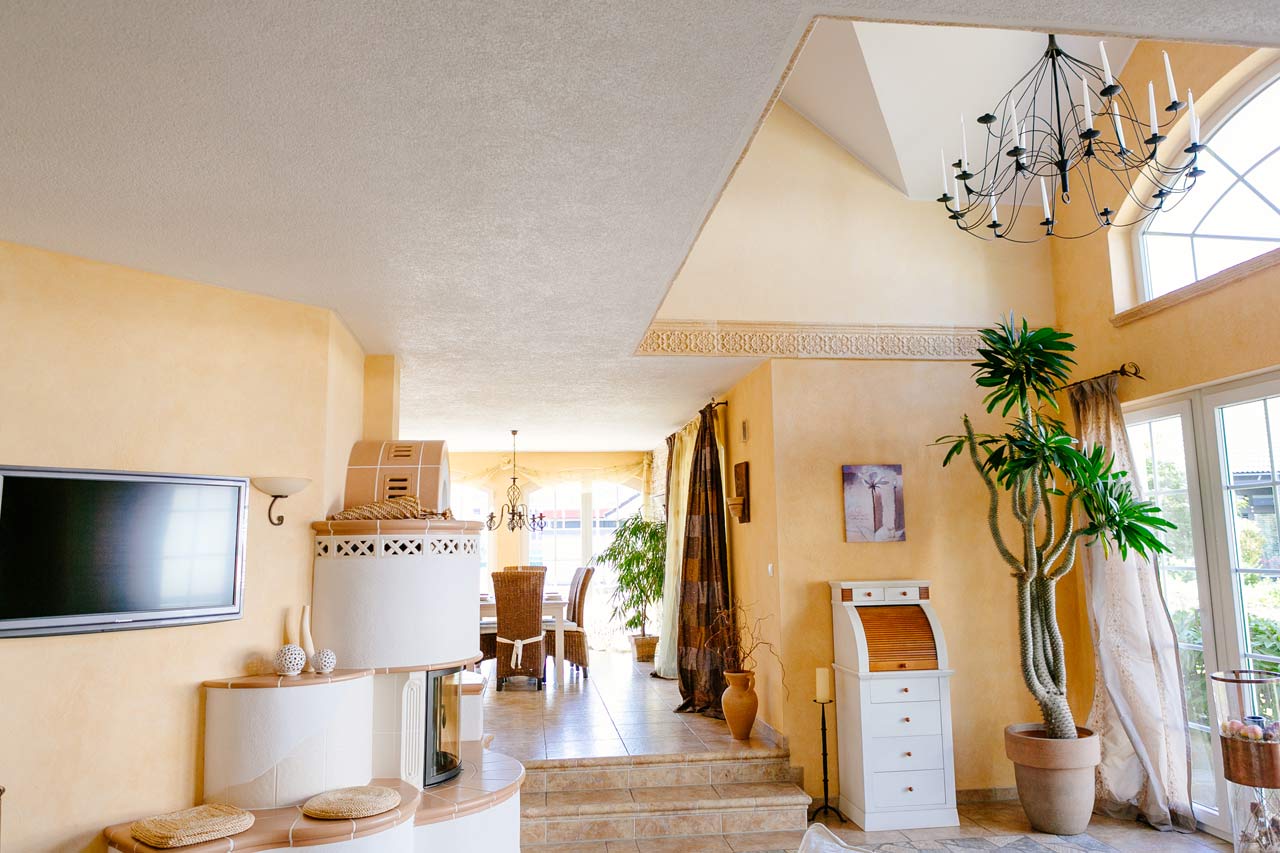 Anspruchsvolles Wohnen im mediterranen Stil bietet unser neu errichtetes Wohnhaus im Musterhauszentrum Mülheim-Kärlich. 208 m² nutzbare Grundfläche im Erd- und Dachgeschoß ermöglichen eine großzügige Raumaufteilung. Hinter dem überdachten, auf Säulen ruhenden Eingangsbereich erwartet den interessierten Kunden eine offene Diele. Mehr als 50 m² Fläche im Ess- und Wohnzimmer bieten großzügigen Platz mit bodentiefen Fenster- und Türelementen für eine lichtdurchflutete Stimmung.