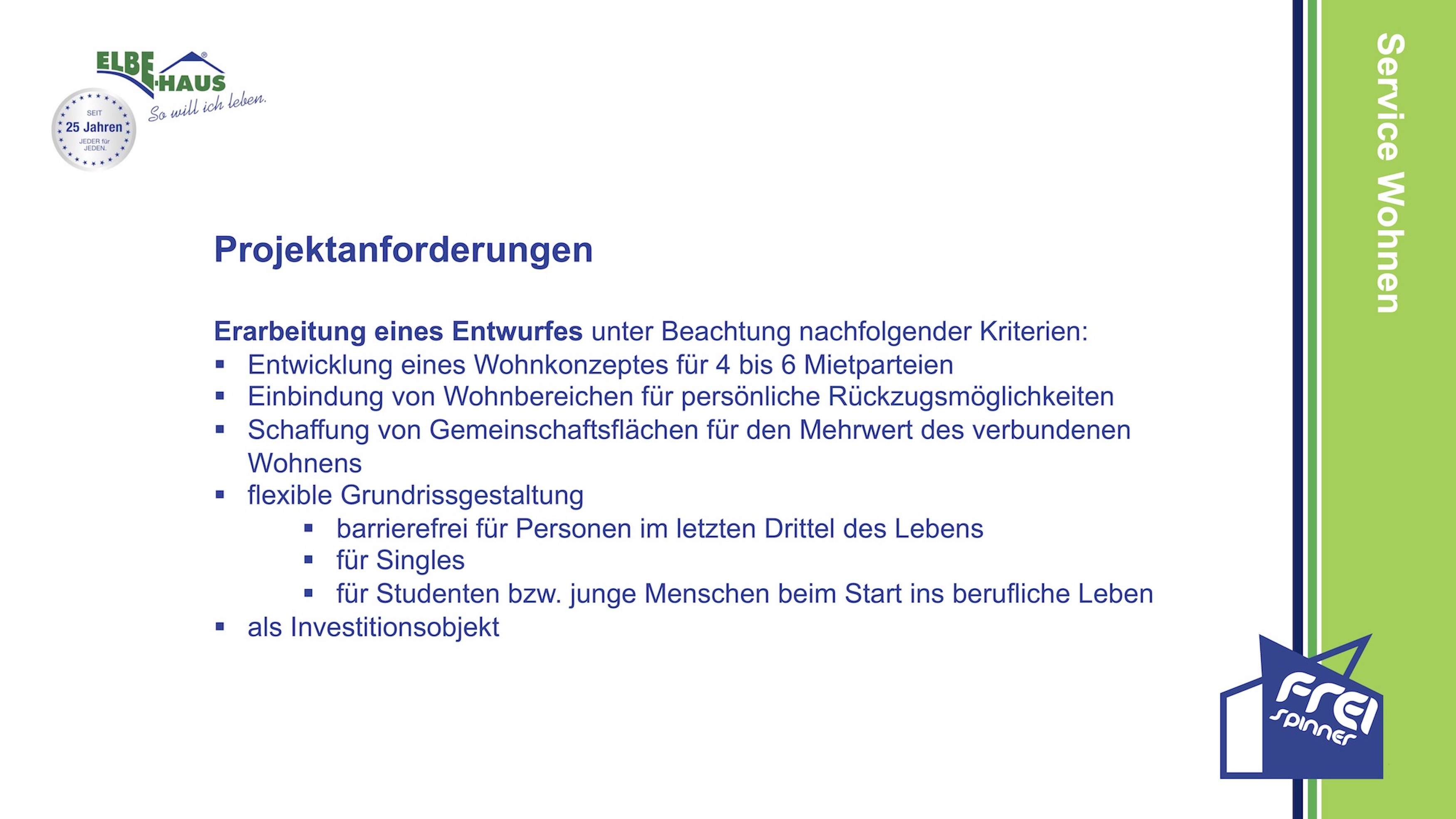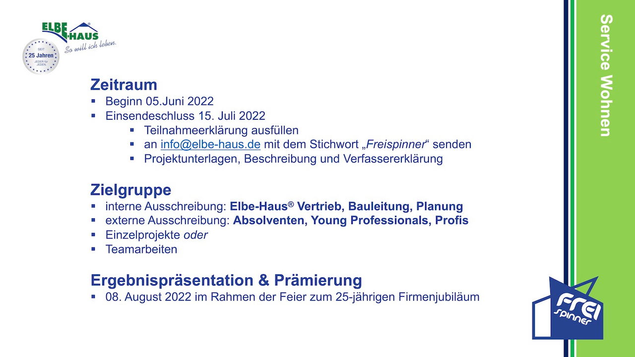 Auch in diesem Jahr wollen wir kreative Ideen von Nachwuchstalenten und Berufsprofis fördern und auszeichnen. In unserem deutschlandweiten Freispinner-Wettbewerb, den wir gemeinsam mit unseren Geschäftspartnern (XELLA, Vaillant und der NFG) ausrichten, freuen wir uns auf Einsendungen rund um das Thema Service Wohnen. Erfahren Sie alle Details in den Ausschreibungsunterlagen.