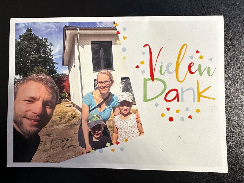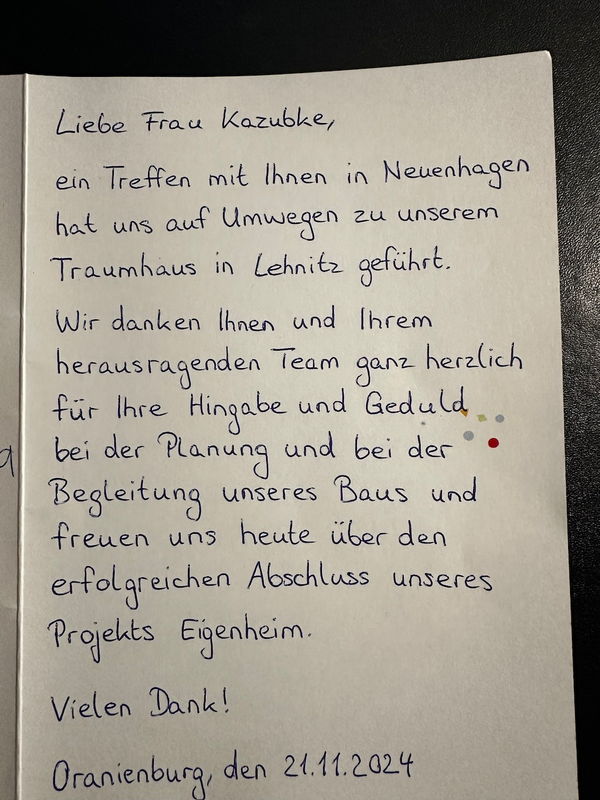 Familie Sch. bedankte sich beim Verkauf und der Bauleitung von Elbe-Haus® mit einem Präsent und einer persönlichen Karte. Auch uns macht es immer wieder sehr stolz, das Strahlen im Gesicht unserer Bauherren zu sehen und lobende Worte zu hören.