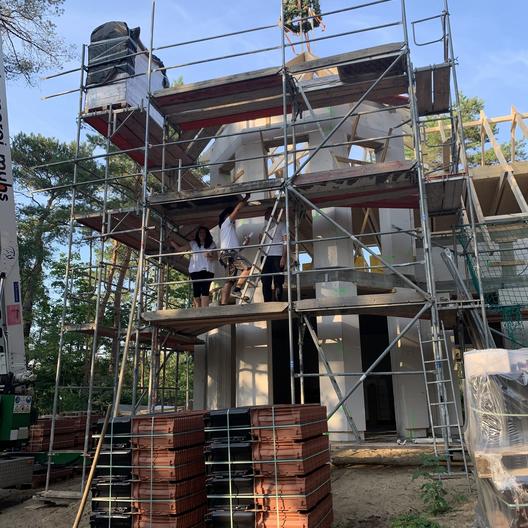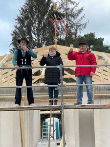 Umso glücklicher waren die Bauherren am 19.03.2024, dass Sie ihrem Haus nun endlich die Richtkrone aufsetzen konnten. Die Bauleiterin, Frau Kathrin Bergmann hat mit den Kollegen von der Zimmermannsfirma das Haus geputzt und so konnten alle Gäste den prachtvollen Bau bewundern.