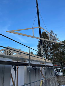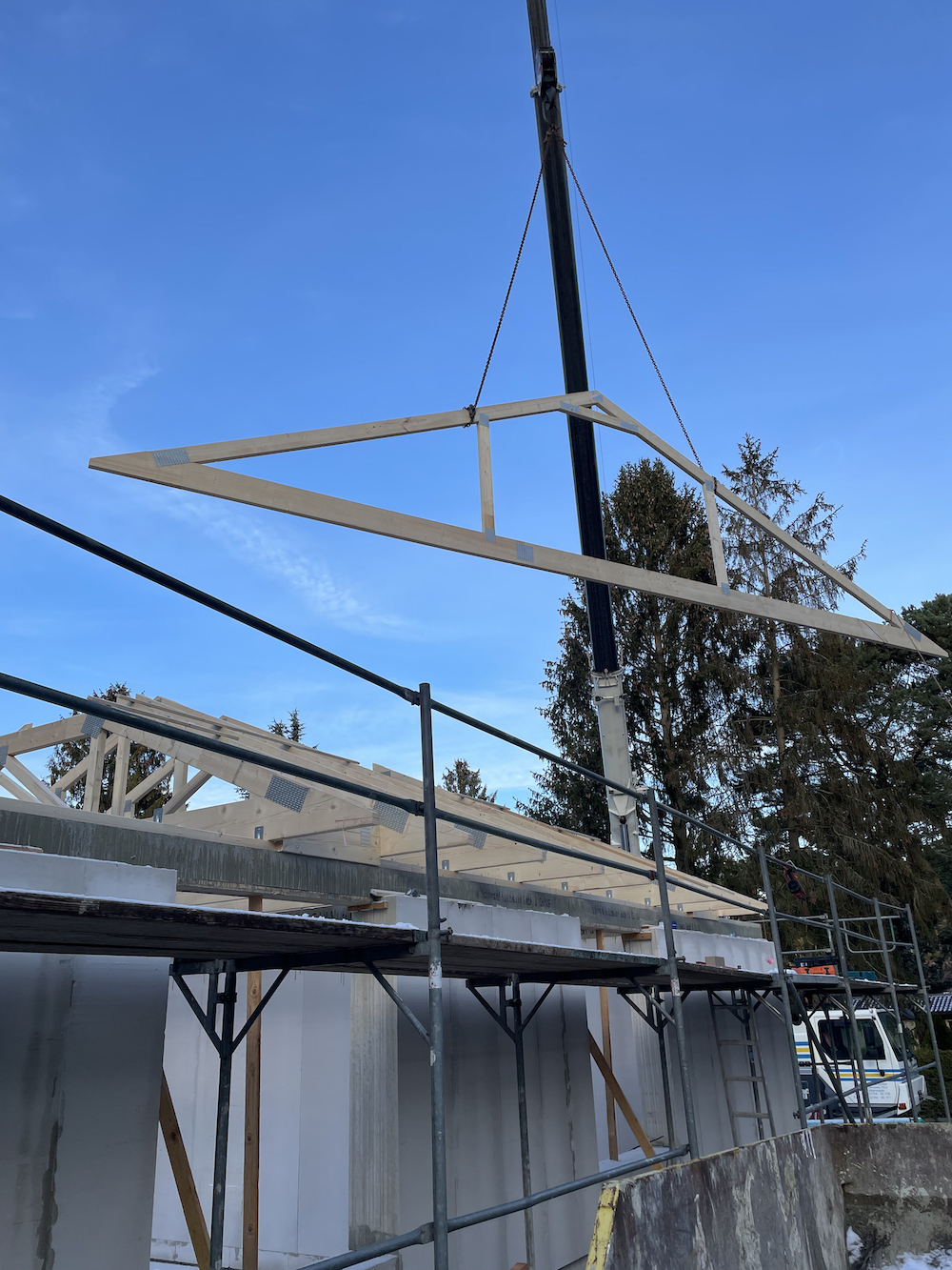 Und dann ist es endlich soweit! Der Dachstuhl wird aufgebaut und die Richtkrone angebracht. Stolz und glücklich können unsere Bauherren auf ihr neues Haus schauen und mit Ihren Gästen darauf anstoßen.