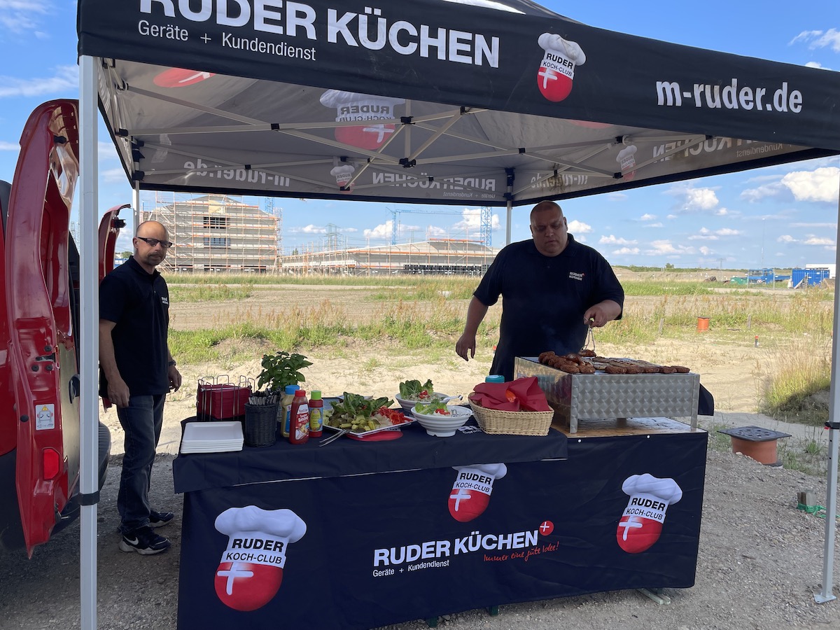 Um so größer war die Freude am 06.07.2023 das Richtfest mit rund 30 Gästen bei strahlendem Sonnenschein zu feiern. Natürlich waren neben der Bauleiterin Frau Simone Winkler, der Architektin Frau Sabrina Böhm und den Zimmermannsleuten, die den traditionellen Richtspruch gehalten haben, auch die Firma Küchen-Ruder vor Ort. Familie G. hat eine Küche bei der Firma Küchen-Ruder gekauft und das gehört es zur Tradition das Catering zum Richtfest zu übernehmen. Auch der Geschäftsführer der Firma Küchen-Ruder, Herr Mario Ruder ließ es sich nicht nehmen zum Richtfest zu gratulieren.