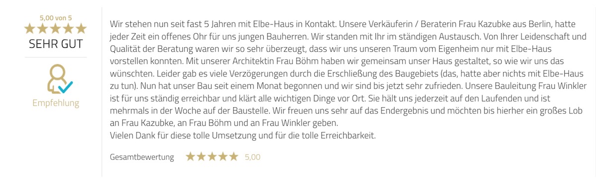 Wir sind mit Elbe-Haus mehr als zufrieden und empfehlen Sie uneingeschränkt weiter.