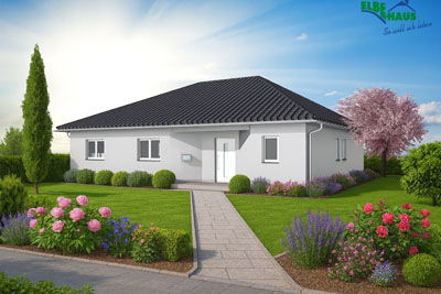 Elbe-Haus® Bungalow/ ca. 112 m2 Nutzfläche (massive Außenwand 30 cm Ytong® Porenbeton, Luft-Wasser-Wärmepumpe, zentrale kontrollierte Be- und Entlüftung mit Wärmerückgewinnung, Fußbodenheizung, Rollläden usw.)