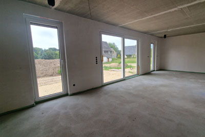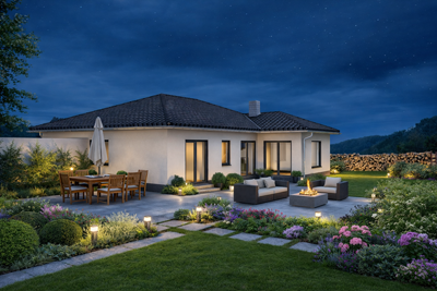 Individuell geplanter Elbe-Haus® Bungalow/ ca. 120 m2 Nutzfläche (massive Außenwand 30 cm Ytong® Porenbeton, Luft-Wasser-Wärmepumpe, zentrale kontrollierte Be- und Entlüftung mit Wärmerückgewinnung, Kaminzug PLEWA UniTherm Panorama mit integrierter Feuerstelle, Fußbodenheizung, Rollläden usw.)