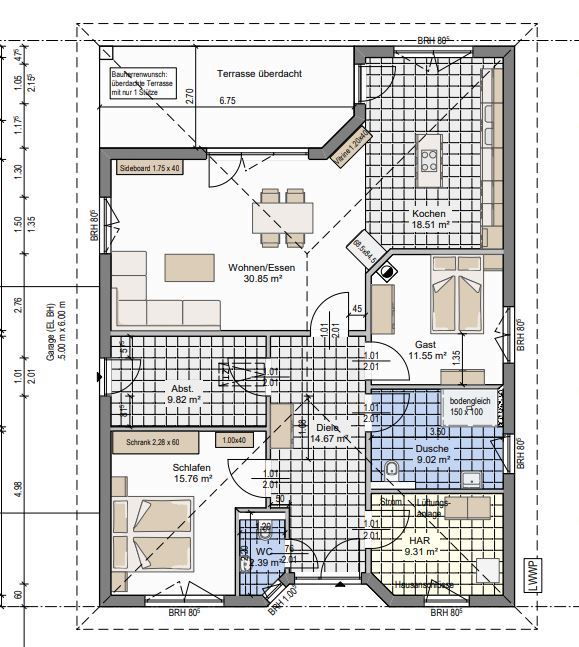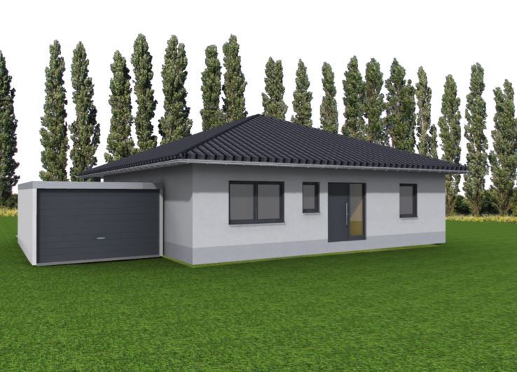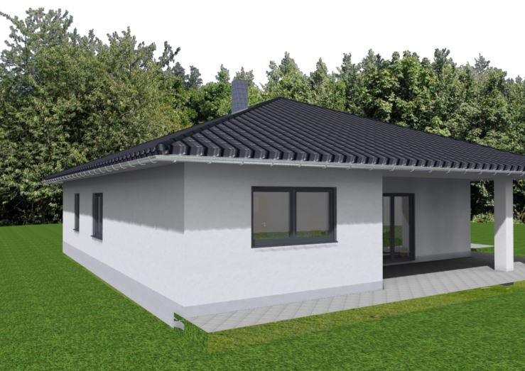 Dieses Bauvorhaben in Fakten: Winkelbungalow mit überdachter Terrasse und eingerücktem Hauseingang, Wohnfläche ca. 123 m2, altersgerecht, extrabreite Türen, ebenerdige Dusche, LWWP mit Kühlfunktion, Lüftungsanlage mit WR, moderne Küche von RUDER-Küchen, Baubeginn März 22