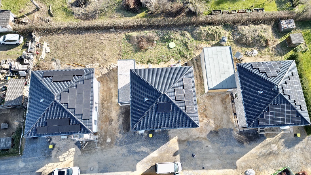 Dieses Bauvorhaben in Fakten: Bauort Bad Münstereifel OT Wald, Baubeginn 02/2023, Stadthausvilla KfW 55 mit Walmdach und ca. 151 m² Grundfläche, Luft-Wasser-Wärmepumpe, Lüftungsanlage mit Wärmerückgewinnung, Fußbodenheizung, elektrische Rollläden, bodengleich geflieste Dusche