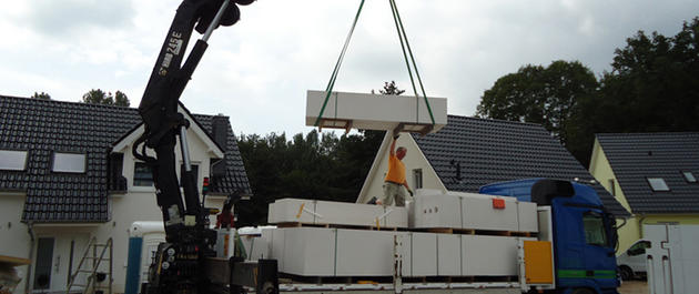 Mitte Juni, also ca. 2 Wochen nachdem die Bodenplatte gegossen wurde, bekam unser Haus sein „Gewand“ in Form von Wänden. Auch dieser Vorgang ging reibungslos über die Bühne, da die Fachleute ein eingespieltes Team waren und genau wussten, was getan werden musste.