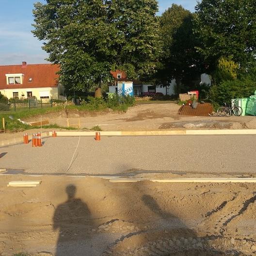 Innerhalb von zwei Tagen wurden 150 Kubikmeter Mutterboden ausgeschachtet, 280 Tonnen Füllsand geliefert und 160 Tonnen Mischrecycling verdichtet. Parallel wurden Baustrom und -wasser durch die örtlichen Versorger angeschlossen.