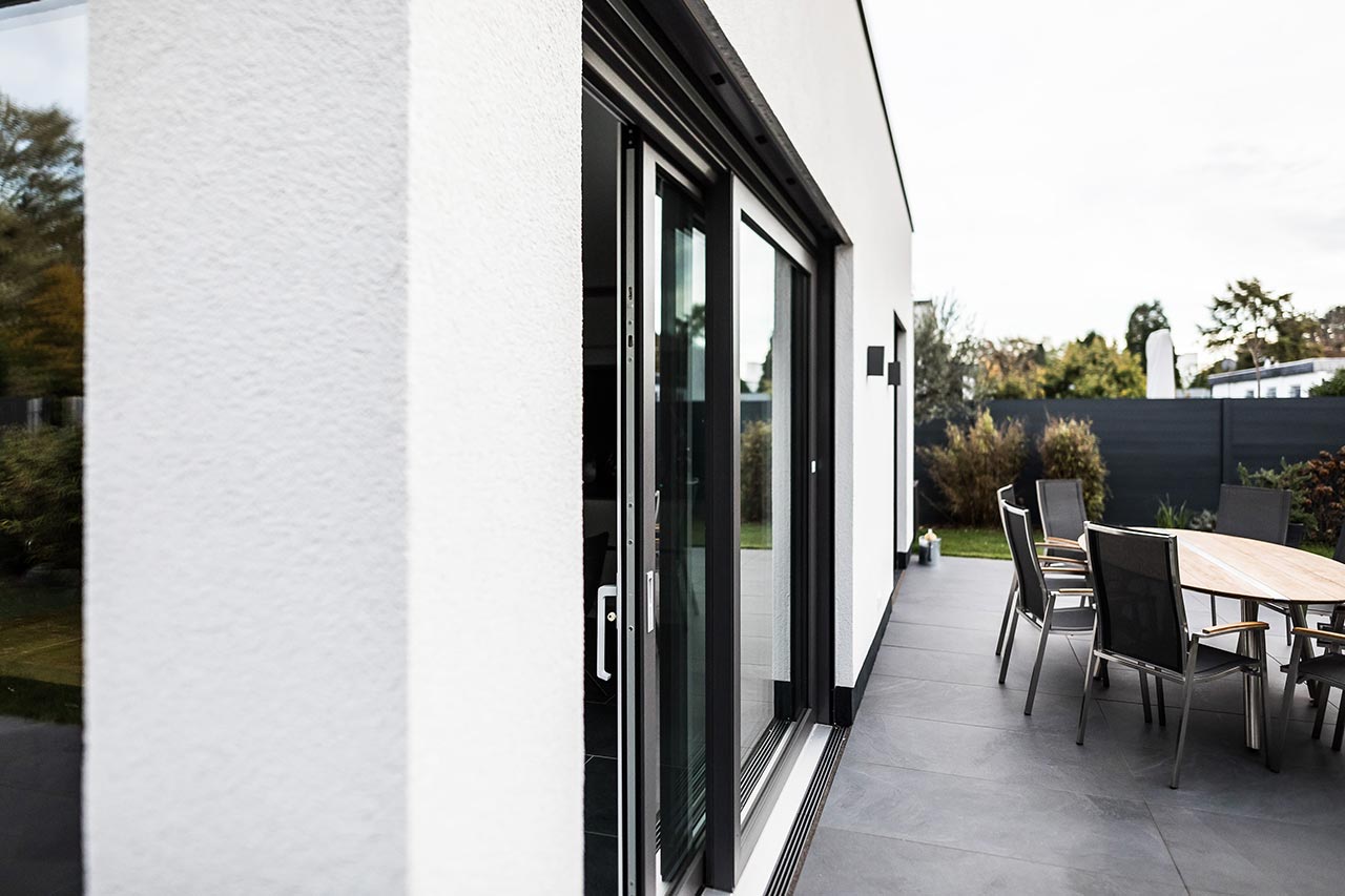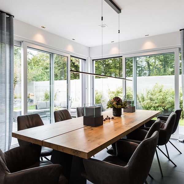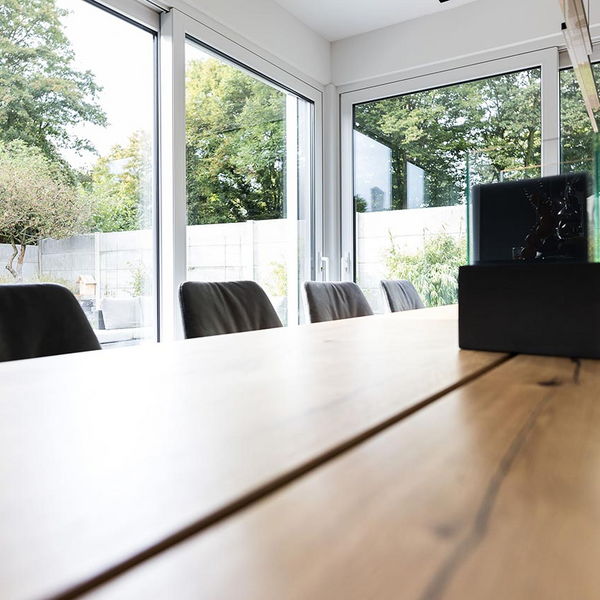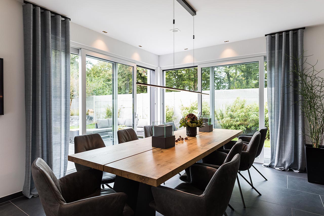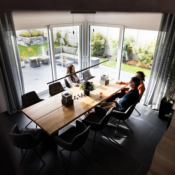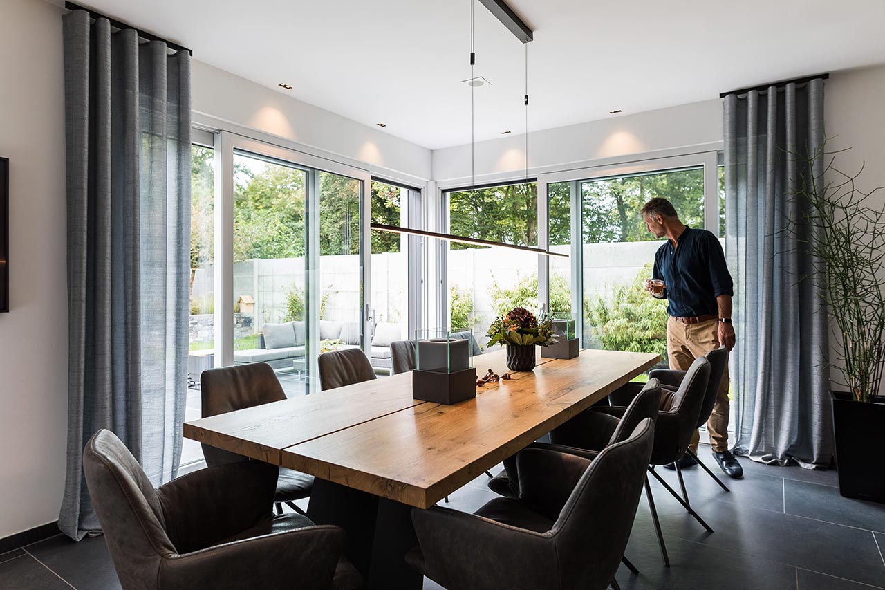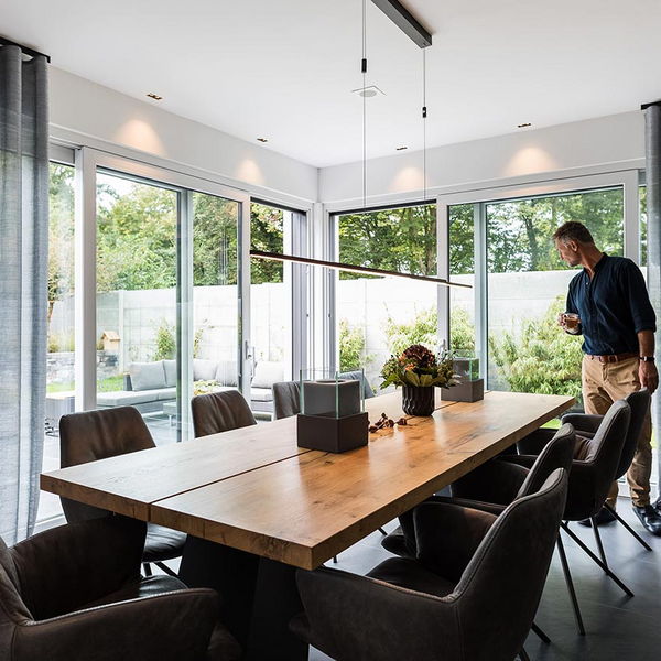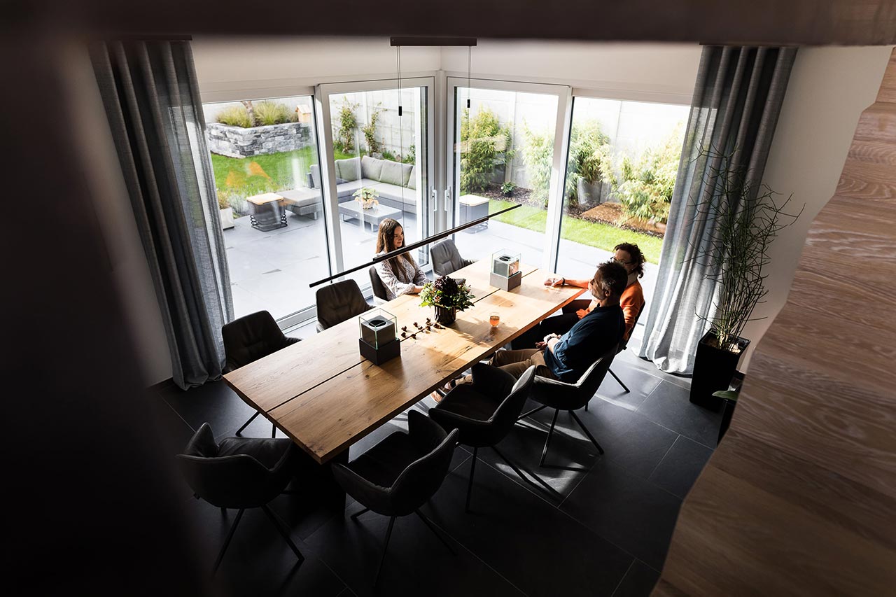 "Auch der Blick in den Garten. Und auch da fanden wir es sehr gut, wie Frau Emde es ermöglicht hat, dass man beide Glasfronten öffnen kann. Es war draußen schon einmal richtig kalt und regnete. Wir hatten beide Schiebetüren auf und saßen hier im Esszimmer. Wir waren also quasi im Garten, aber trotzdem trocken, geschützt und warm."