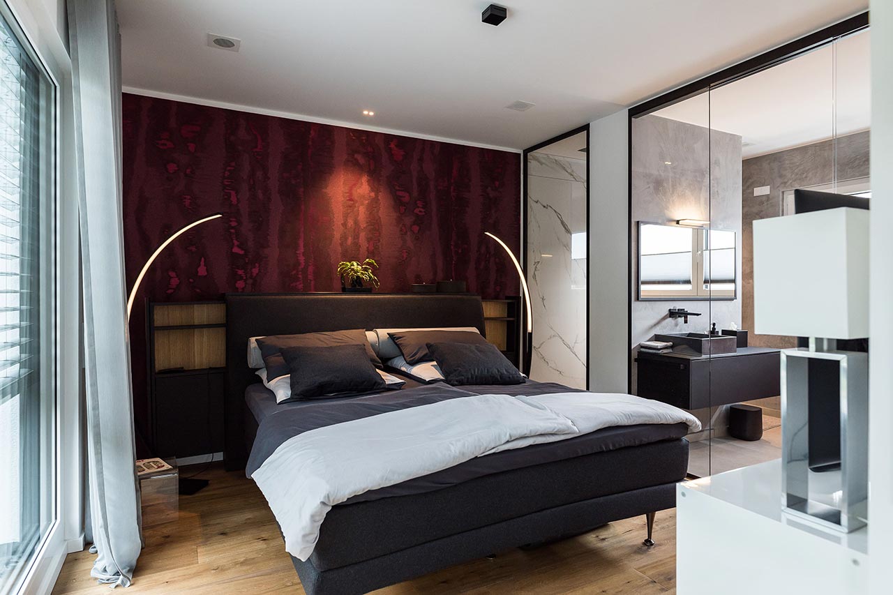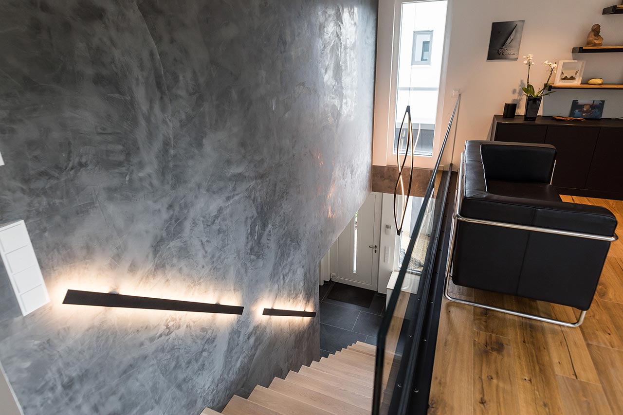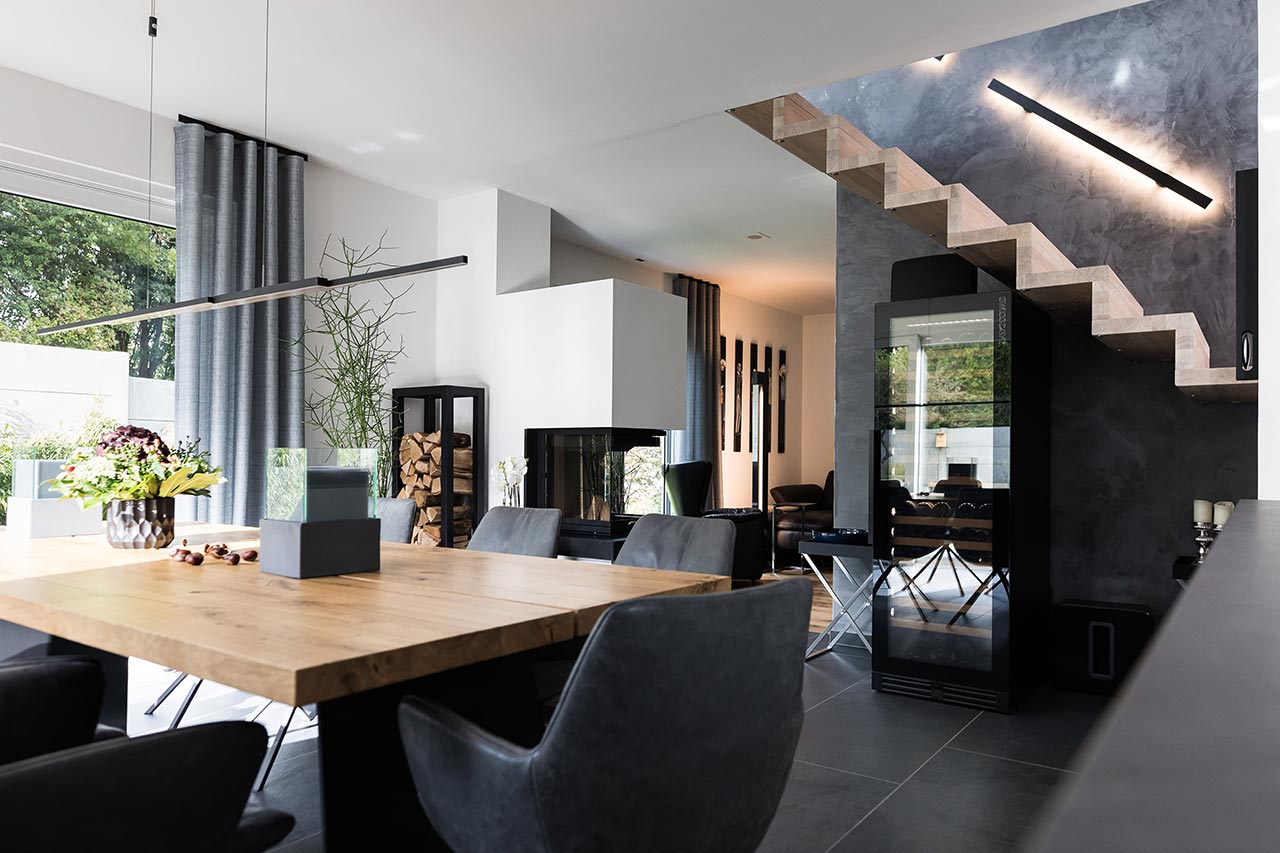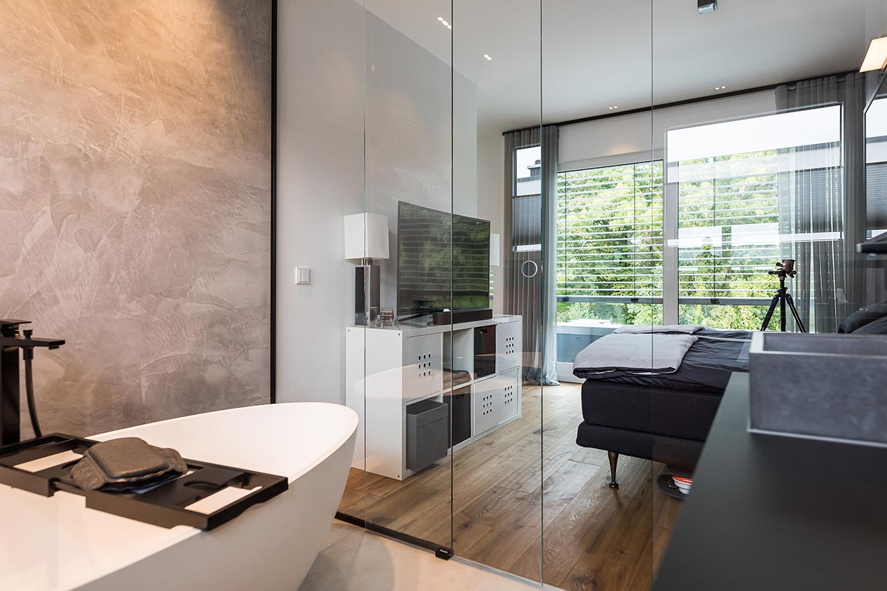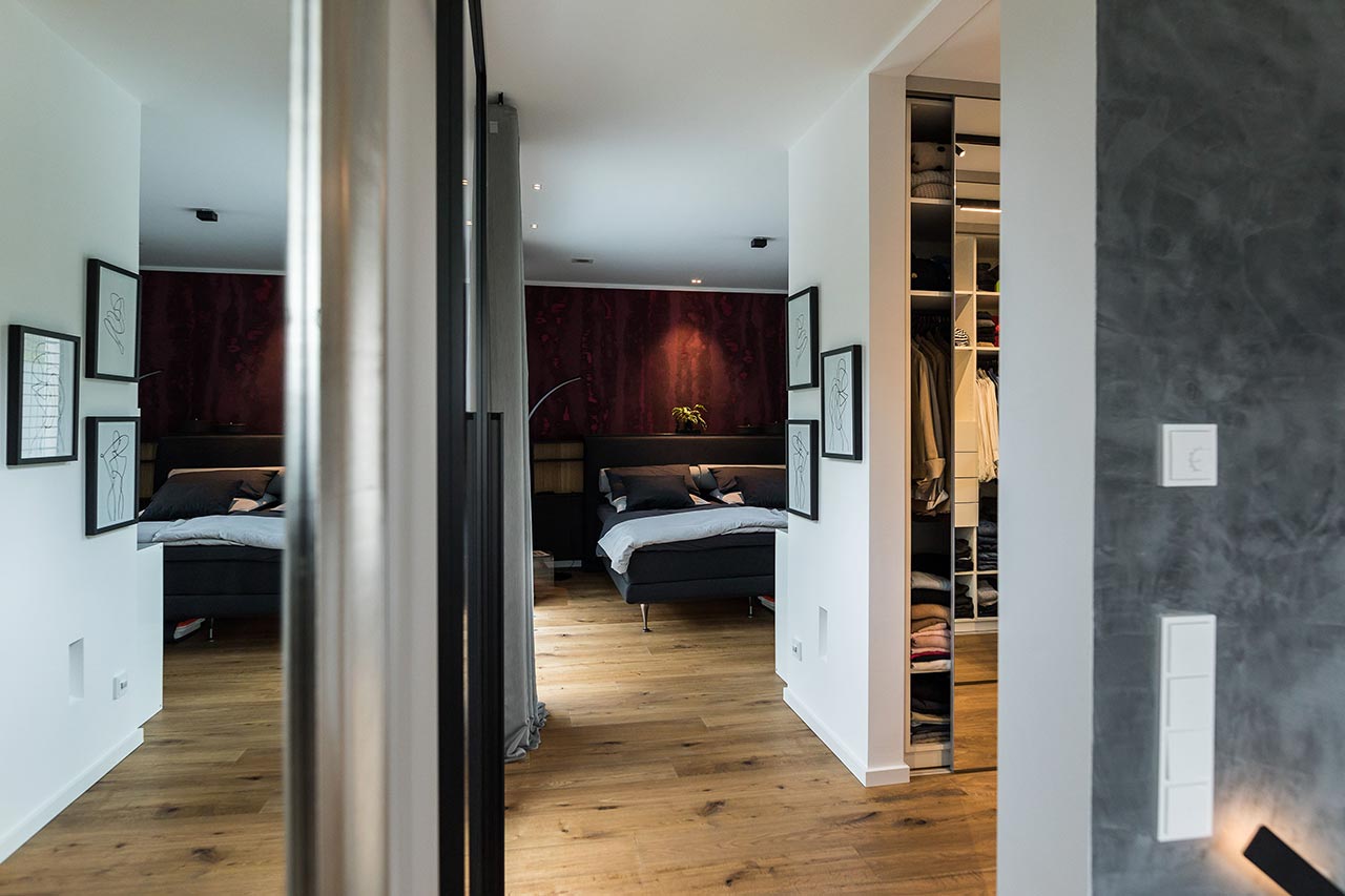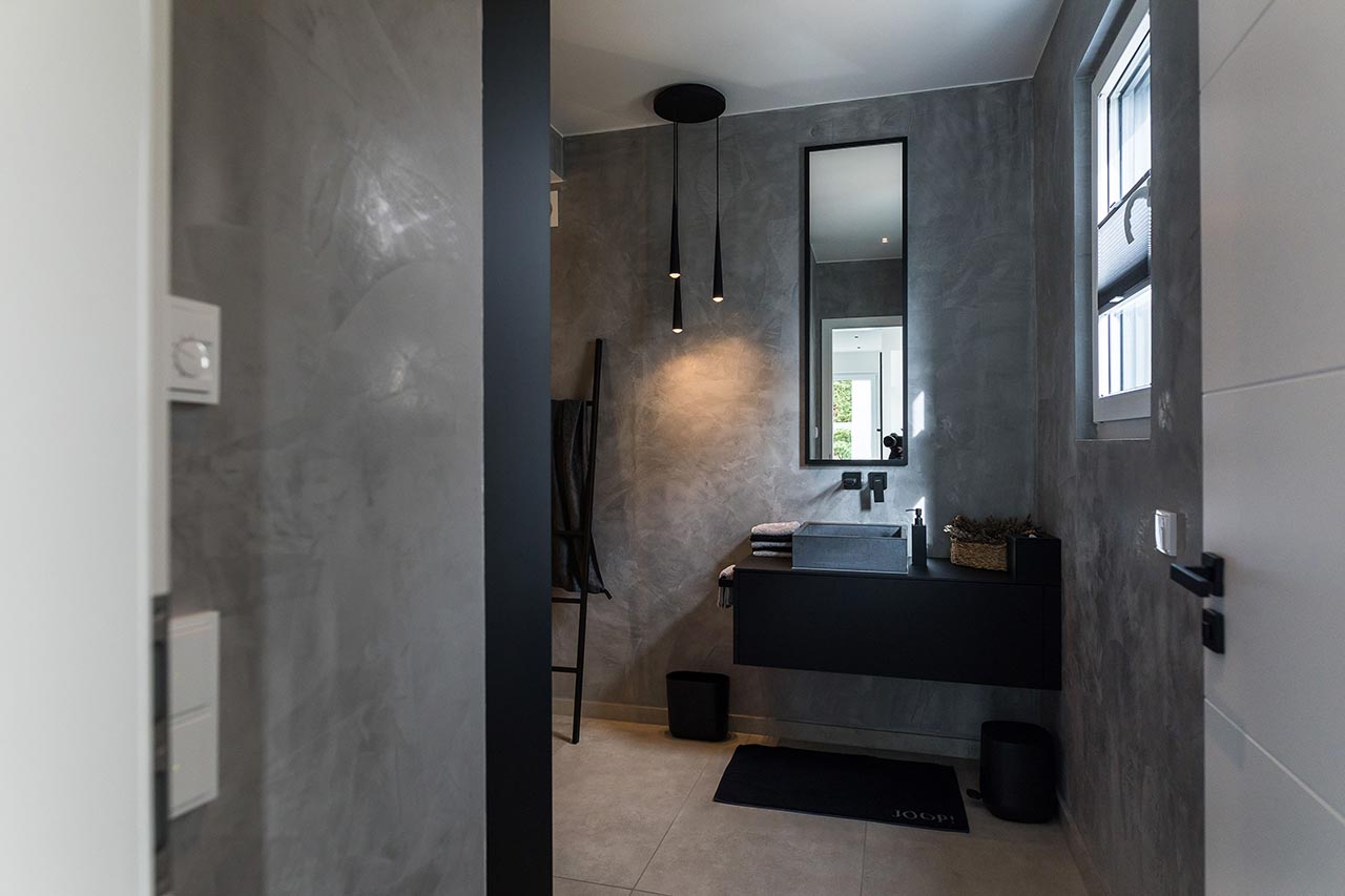 "… Ja! Für mich sind klare Formen immer schon wichtig gewesen. Ich liebe den Bauhausstil, habe mich viel mit Bauhaus beschäftigt und daraus ist es dann entstanden. Von den Farben her war das für mich auch passend. Nicht weil Grau gerade modern ist, sondern weil ich schon immer grau-weiße Elemente hatte. Das dritte Farb-Element, was jetzt noch hinzugekommen ist, ist Schwarz. Zudem haben wir eine Fertighaus-Ausstellung besucht, um Einrichtungsideen zu sammeln. Auch das Haus von Frau Emde war für uns natürlich eine große Inspiration. Dort gab es ja auch diese offene Treppe und ein Badezimmer, dass an das Schlafzimmer angrenzt."