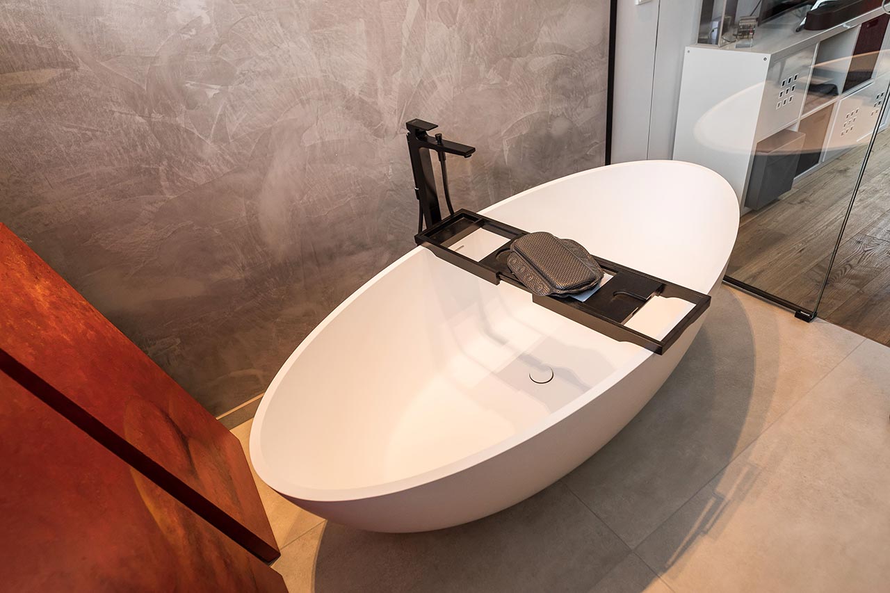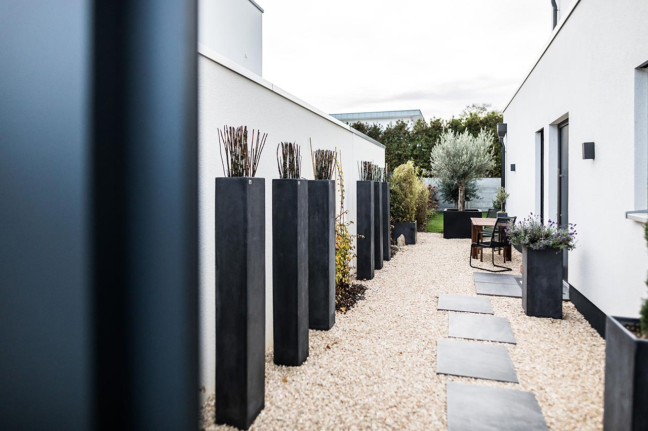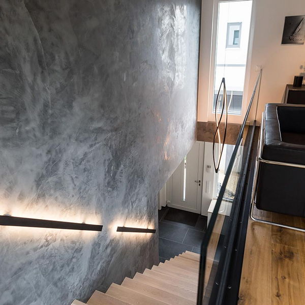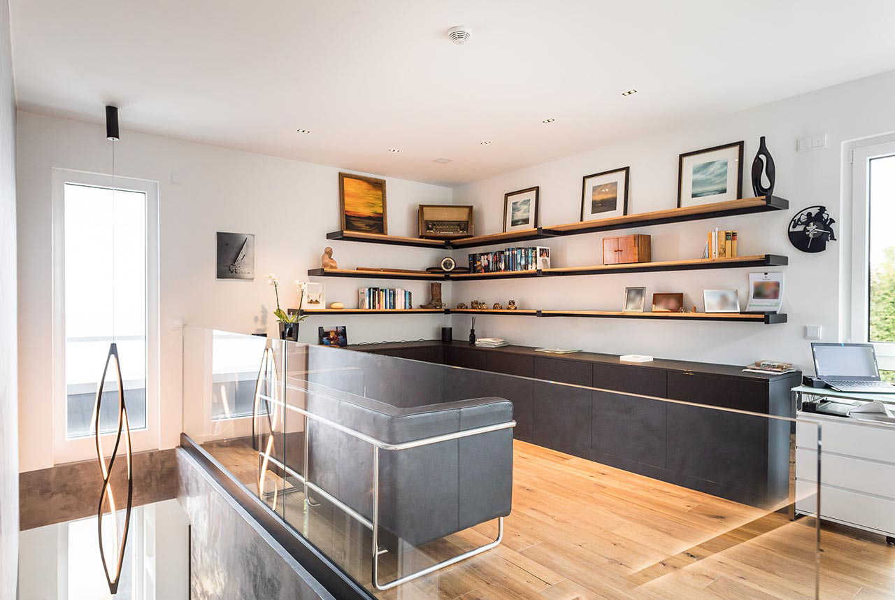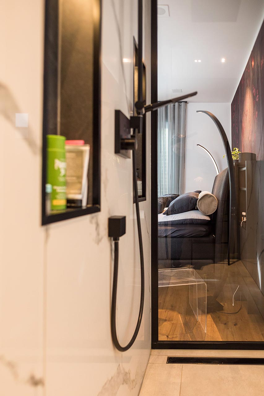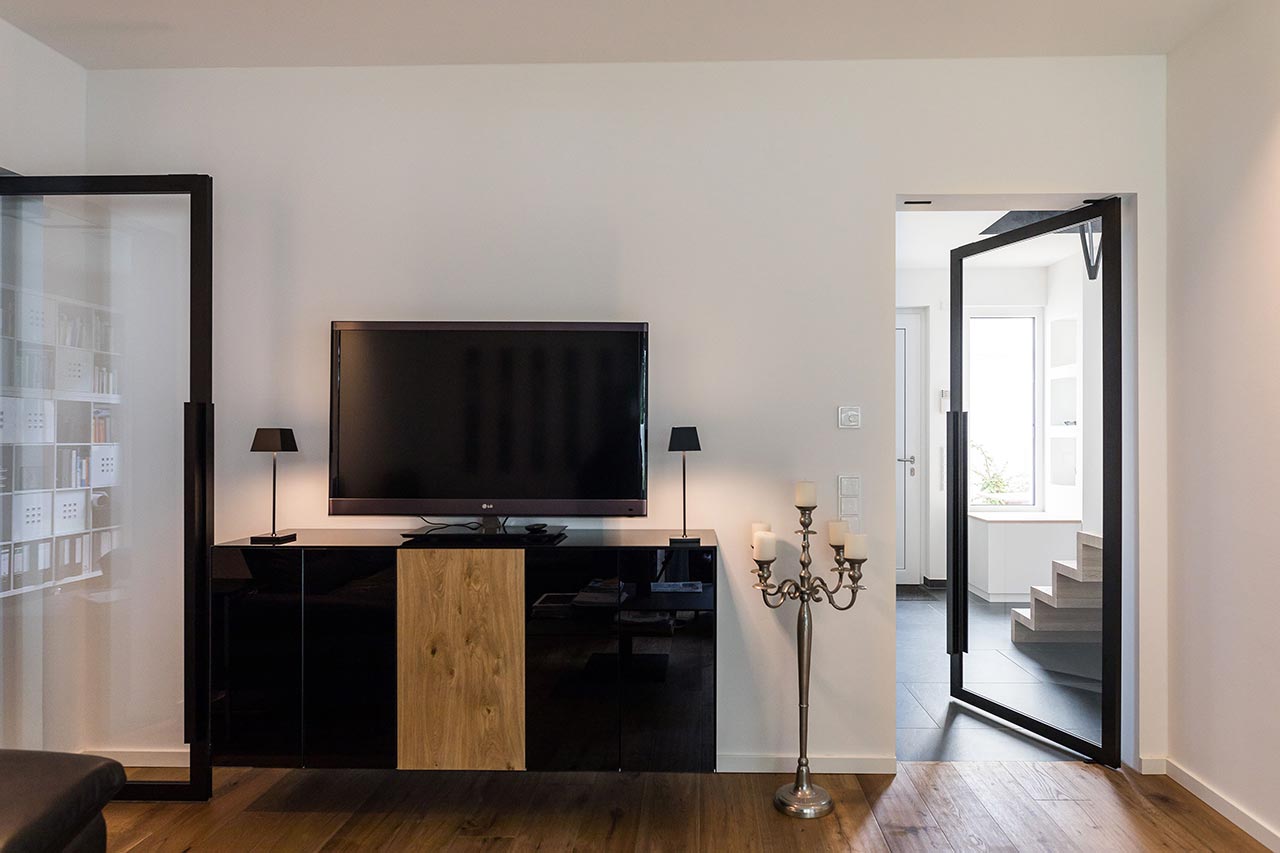 "… Ja! Für mich sind klare Formen immer schon wichtig gewesen. Ich liebe den Bauhausstil, habe mich viel mit Bauhaus beschäftigt und daraus ist es dann entstanden. Von den Farben her war das für mich auch passend. Nicht weil Grau gerade modern ist, sondern weil ich schon immer grau-weiße Elemente hatte. Das dritte Farb-Element, was jetzt noch hinzugekommen ist, ist Schwarz. Zudem haben wir eine Fertighaus-Ausstellung besucht, um Einrichtungsideen zu sammeln. Auch das Haus von Frau Emde war für uns natürlich eine große Inspiration. Dort gab es ja auch diese offene Treppe und ein Badezimmer, dass an das Schlafzimmer angrenzt."
