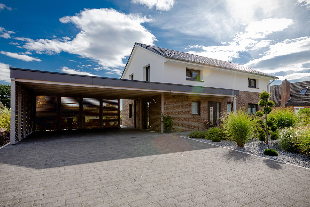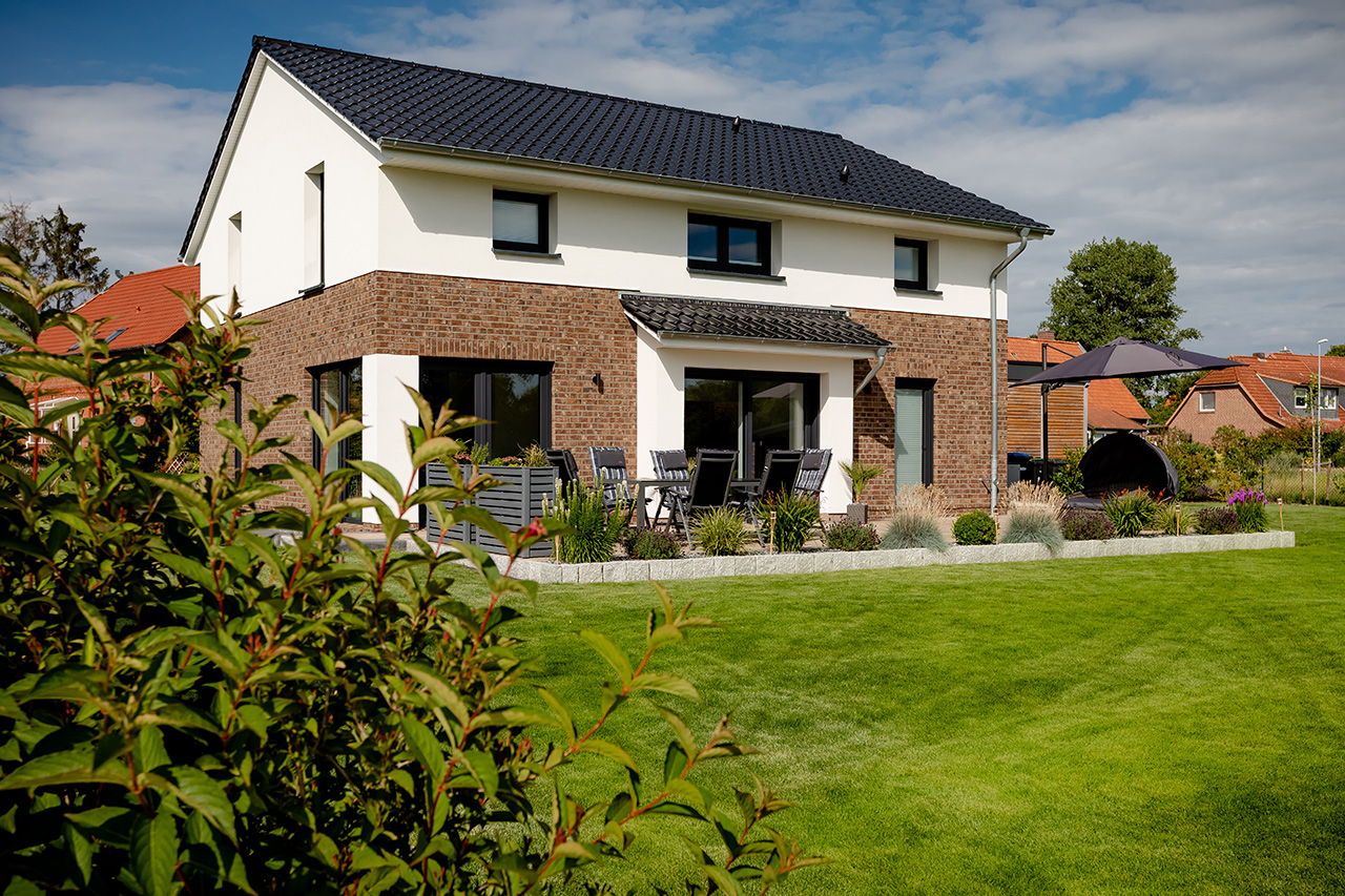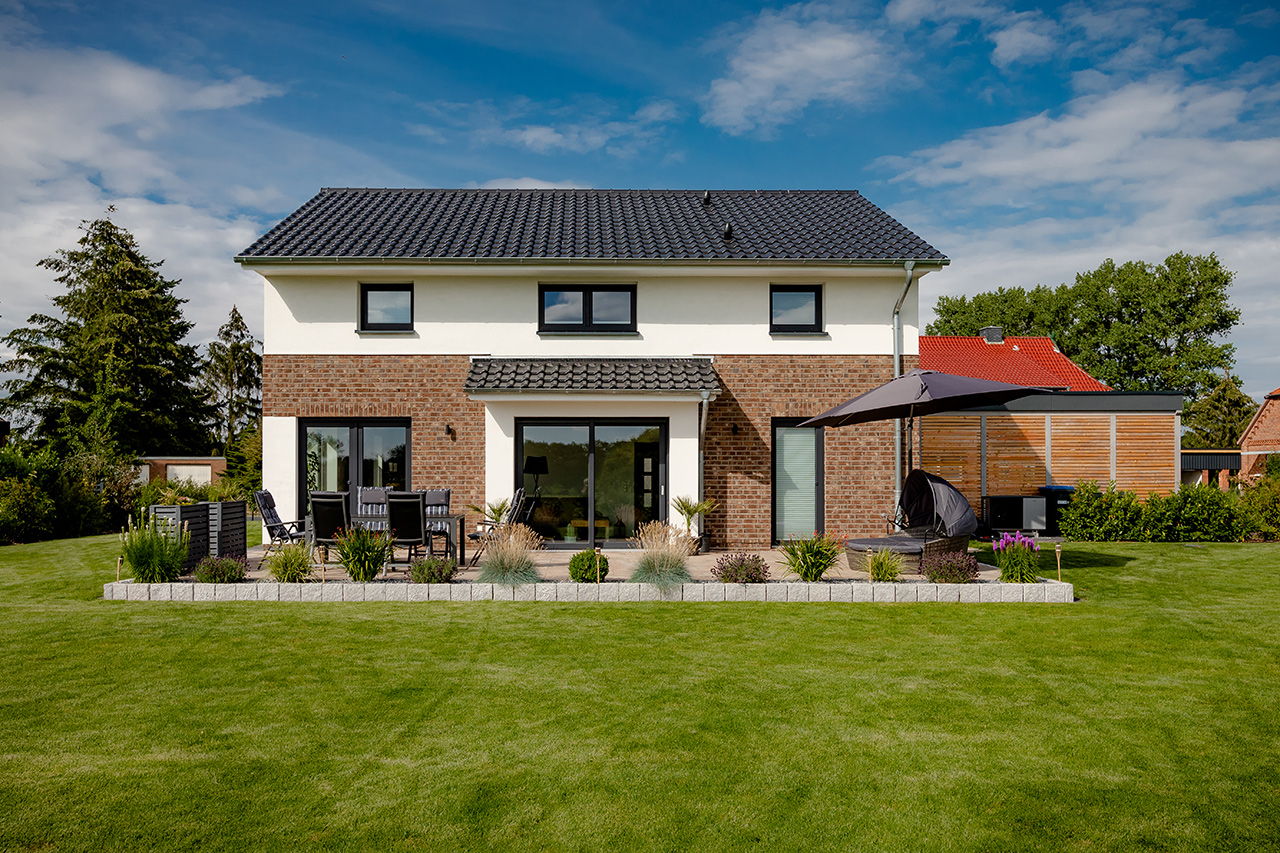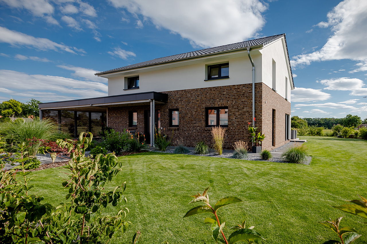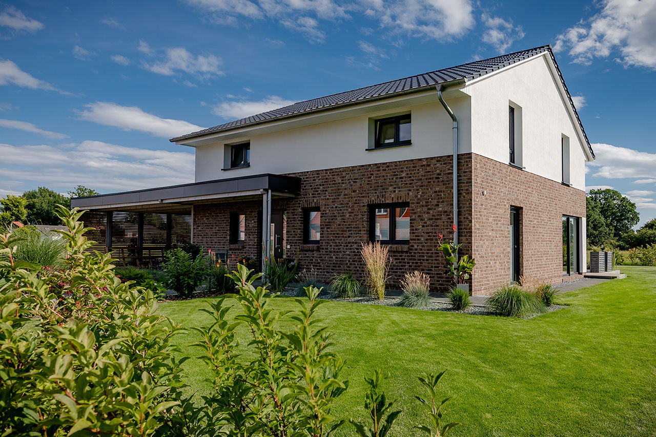 Impressionen Satteldachhaus mit Putz und Verblendstein