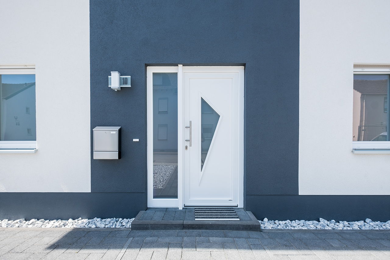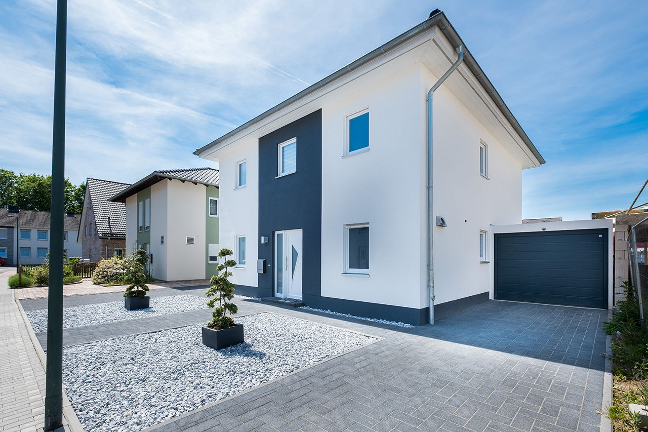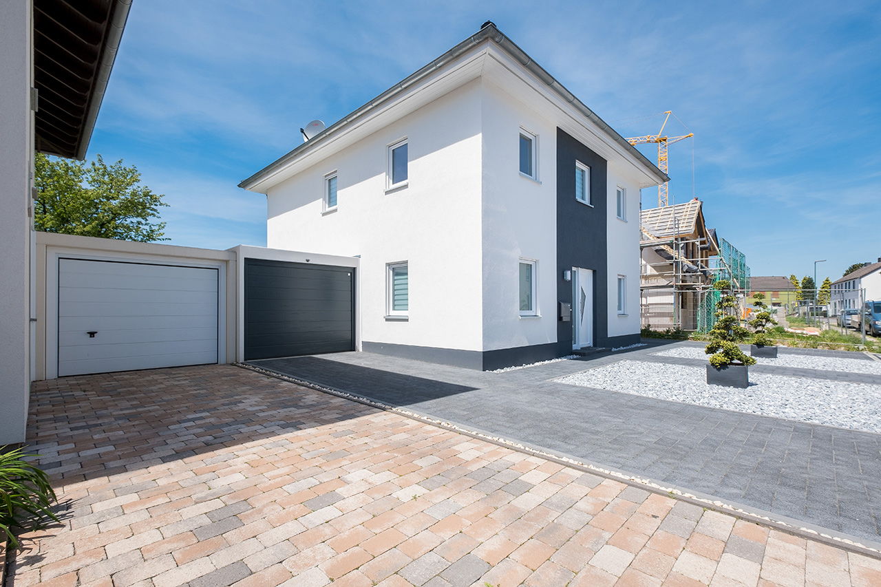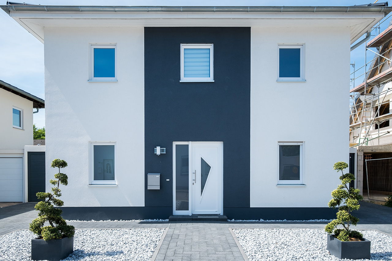 Impressionen weiße Stadtvilla mit grauem Putzstreifen