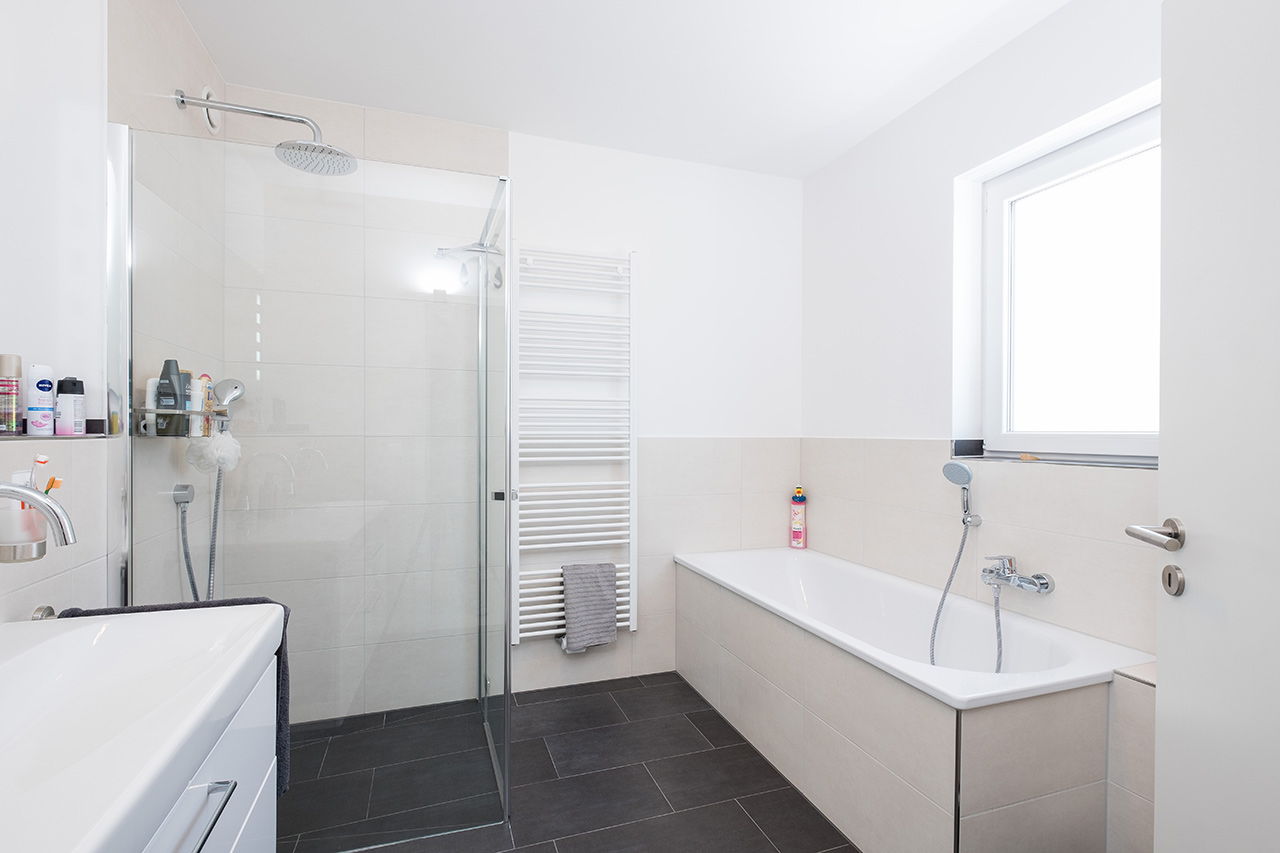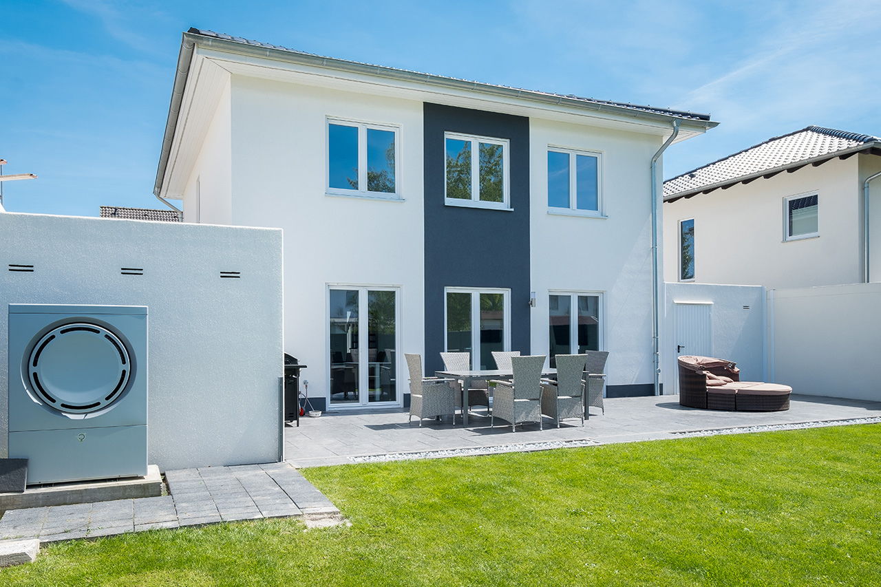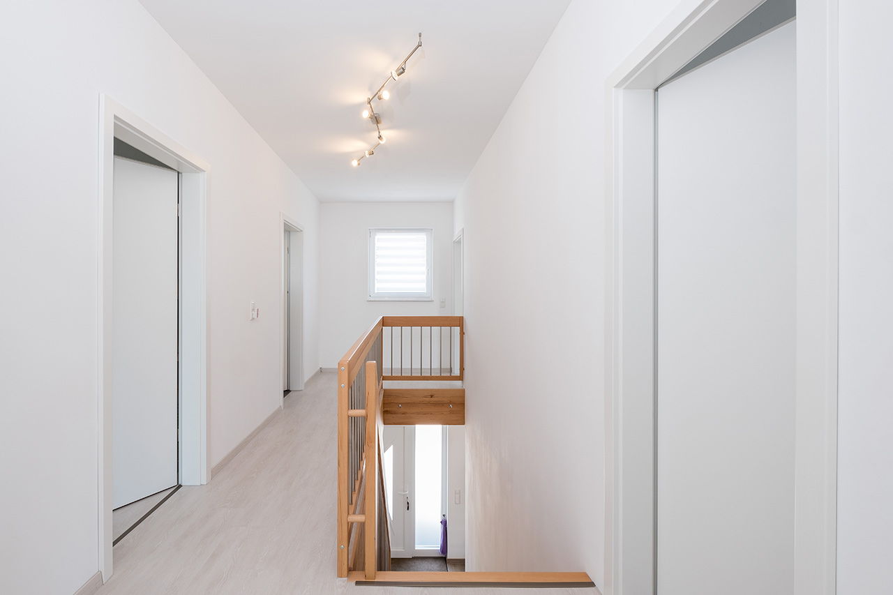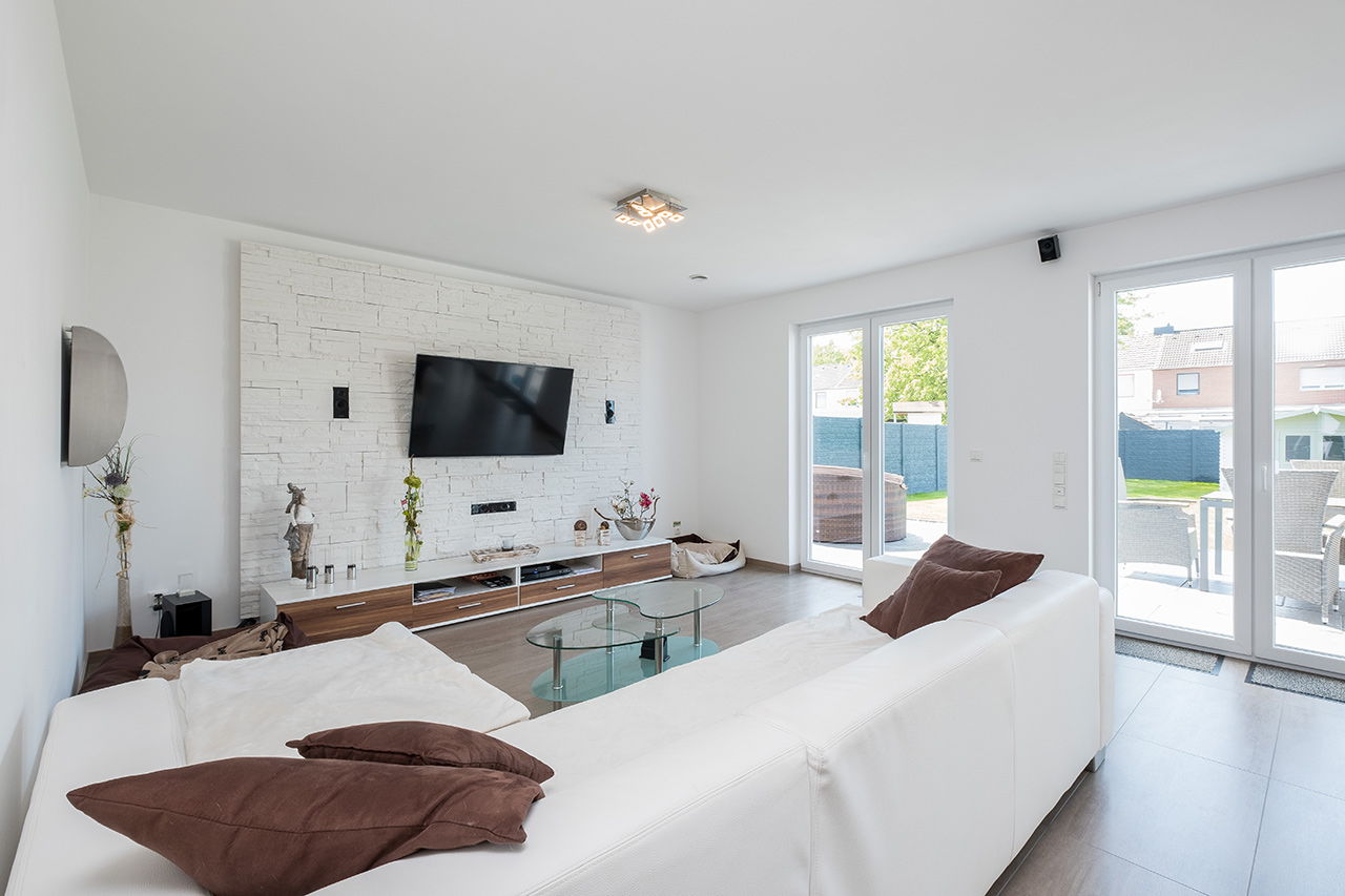 Impressionen weiße Stadtvilla mit grauem Putzstreifen