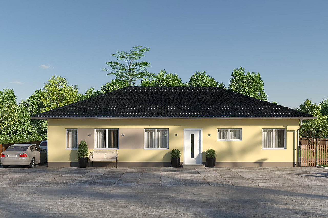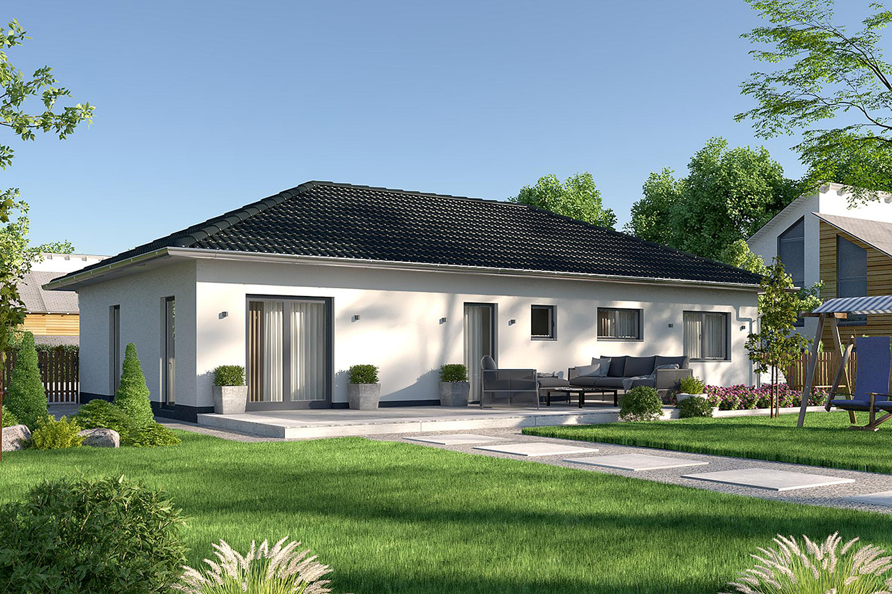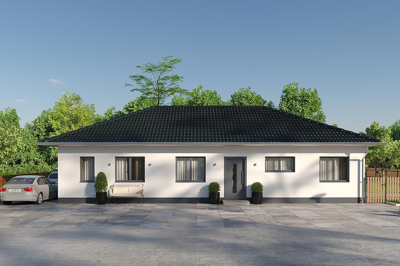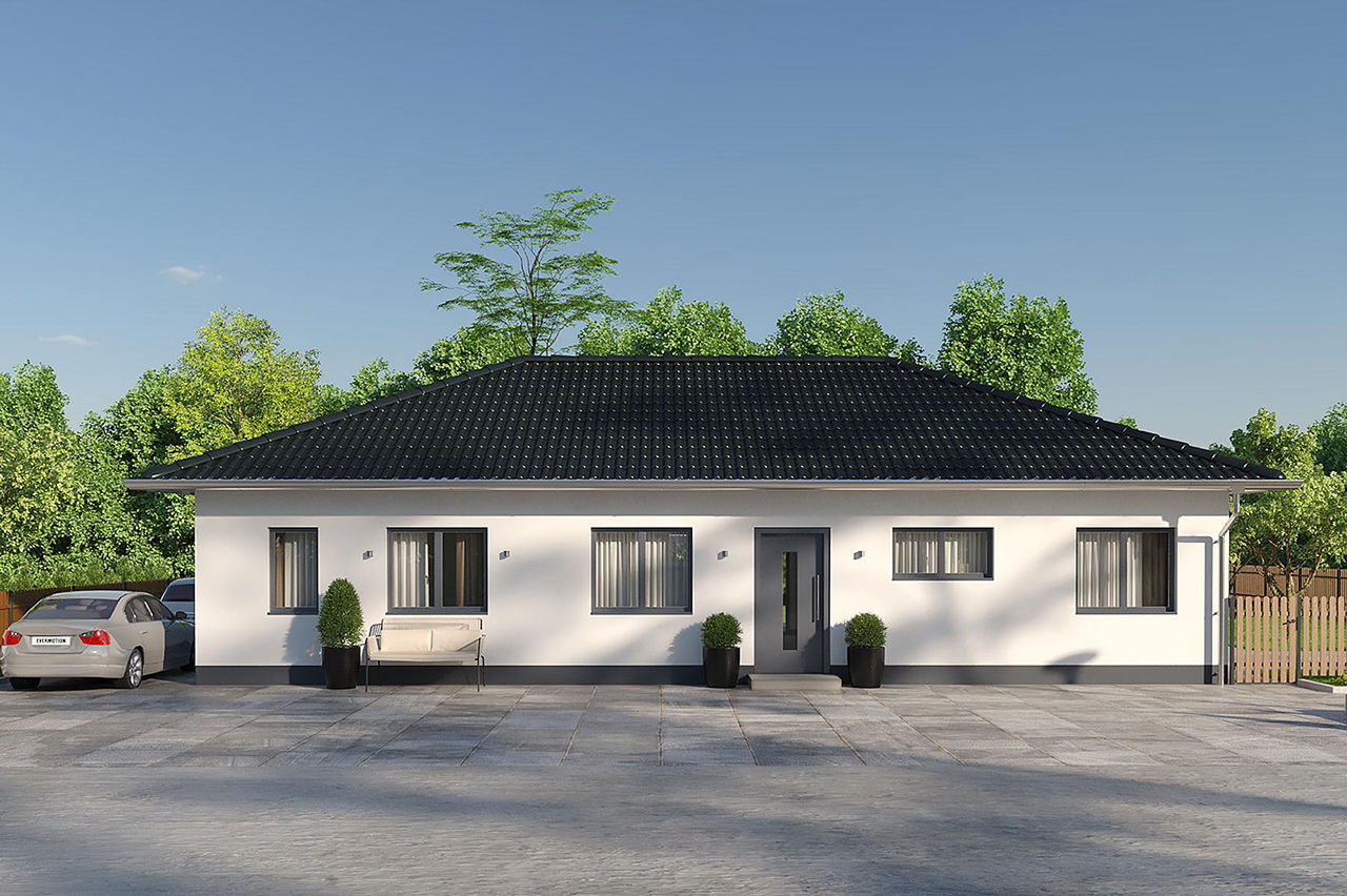 4 Zimmer, 100 m2 , eine offene Küche, ein Badezimmer und ein Gäste-WC. Und das alles auf einer Ebene. Das sind nur ein paar der Vorzüge dieser Bungalow-Variante samt Walmdach, die Platz für die gesamte Familie bietet. Durch die Dachform ist der Bungalow wind- und regenresistenter als Modelle mit Satteldach, hält höheren Schneelasten stand und ist leicht zu pflegen. Hinzu kommen verschiedene Auswahlmöglichkeiten in puncto Fassade, Innenraumgestaltung oder Ausstattung. Egal, ob Dachziegelfarbe, Hauseingangstür oder Badezimmerserie – wählen Sie Ihr liebstes Design und das passende Material aus unserem umfassenden Produktportfolio namhafter Hersteller und lassen Sie Ihre Wünsche Wirklichkeit werden.