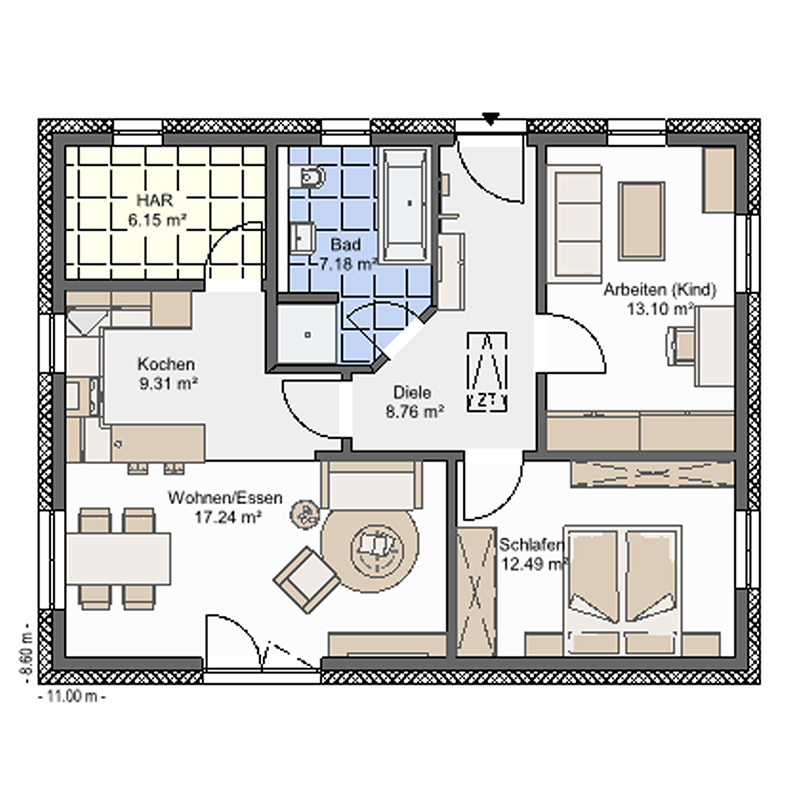 Der Wunsch nach dem Zuhause auf einer Ebene wird immer größer. Dank seiner Breite von 8 Metern kann unser Bungalow 3-75 auf verschiedensten Grundstücksflächen – auch auf sehr kleinen – gebaut werden. Die besonderen Merkmale dieses Bungalows unterstreichen die Vorzüge des ebenerdigen Wohnens: Die offene Küche, nahtlos in den Wohn- und Essbereich integriert, schafft eine einladende Atmosphäre, in der sich die ganze Familie und auch Gäste wohlfühlen. Die unmittelbare Nähe des Hausanschlussraums zur Küche garantiert höchste Funktionalität. Dazu nutzt der Bungalow mit seinen 3 Zimmern auf einer Ebene das Raumangebot optimal aus. Hier finden kleine Familien ausreichend Platz, um sich, abseits von der gemeinsamen Familienzeit, individuell entfalten zu können. Ein weiteres Highlight: Die doppelflügelige Terrassentür im Wohnzimmer ermöglicht den direkten Zugang zum Außenbereich und schafft eine helle und einladende Atmosphäre. Unser klimafreundlicher Bungalow vereint Komfort und Funktionalität auf eindrucksvolle Weise und lässt den Traum vom Wohnen auf einer Ebene für die ganze Familie Wirklichkeit werden.