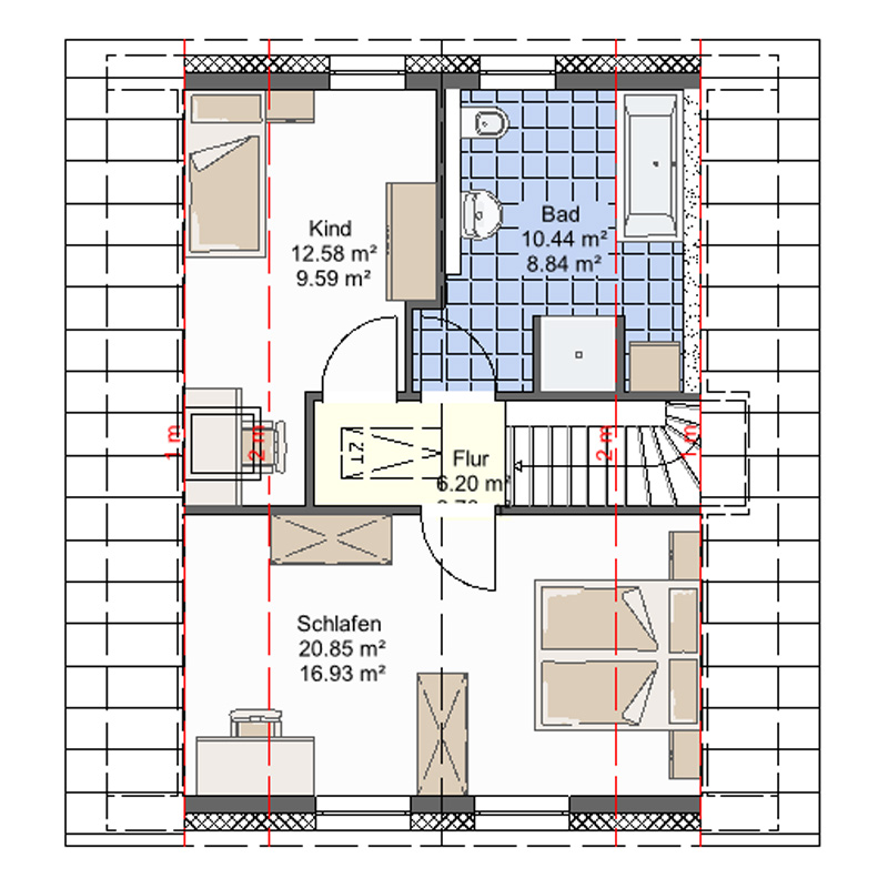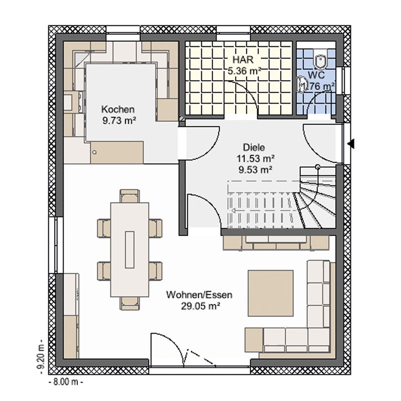 Sie wünschen sich ein Eigenheim im Grünen mit ausreichend Platz für Ihre Liebsten? Einen Ort, an dem Sie sich niederlassen und gemeinsame Erinnerungen schaffen können? Mit dem Satteldachhaus 1-108 aus unserer Serie „Familienfreundlicher Neubau“ kann dieser Traum schon bald für Sie wahr werden. Ein großzügiges Wohn-Esszimmer im Erdgeschoss und die beiden Zimmer im Dachgeschoss bieten viel Platz für gemeinsame Familienrituale oder gesellige Abende mit Freunden. Gleichzeitig stehen ausreichend persönliche Rückzugsmöglichkeiten zur Verfügung. Im Dachgeschoss erwartet Sie ein großes Elternschlafzimmer, welches sich über die gesamte Hausbreite erstreckt. Außerdem finden Sie hier ein gemütliches, kleineres Zimmer – perfekt für Familien mit 1 bis 2 Kindern. Ihre Wohlfühloase, das großzügig geschnittene Badezimmer, beherbergt sowohl eine Badewanne als auch Dusche. Ein weiterer Pluspunkt: das Gäste-WC im Erdgeschoss. Es ist praktisch im Alltag und sichert darüber hinaus die Privatsphäre im Dachgeschoss an geselligen Abenden mit Familien und Freunden.