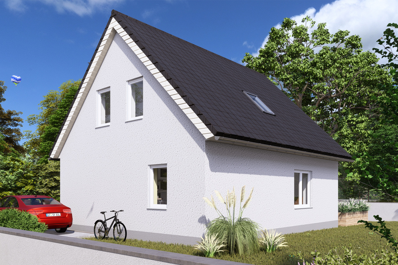 Ein Garten im Grünen. Ein Haus nur für sich. Mit dem Satteldachhaus 1-108 aus unserer Serie „Familienfreundlicher Neubau“ kann dieser Traum schon bald für Sie wahr werden. 3 Zimmer verteilt auf Erd- und Dachgeschoss bieten Platz für die ganze Familie – um gemeinsam Zeit zu verbringen, zu spielen, zu lachen und um Erinnerungen für die Ewigkeit zu schaffen. Herzstück des Hauses ist der großzügige Wohn- und Essbereich mit angrenzender Küche im Erdgeschoss. Und auch die Fläche im Dachgeschoss ist optimal genutzt: Hier befinden sich das Elternschlafzimmer mit ausreichend Raum für einen Homeoffice-Arbeitsplatz sowie ein Kinderzimmer und ein Badezimmer mit Dusche und Badewanne. Das kleinste Haus aus der Serie ist perfekt für Familien mit 1 bis 2 Kindern. Mit seinen ideal aufgeteilten 95 Quadratmetern Wohnfläche überzeugt es auf voller Linie.
