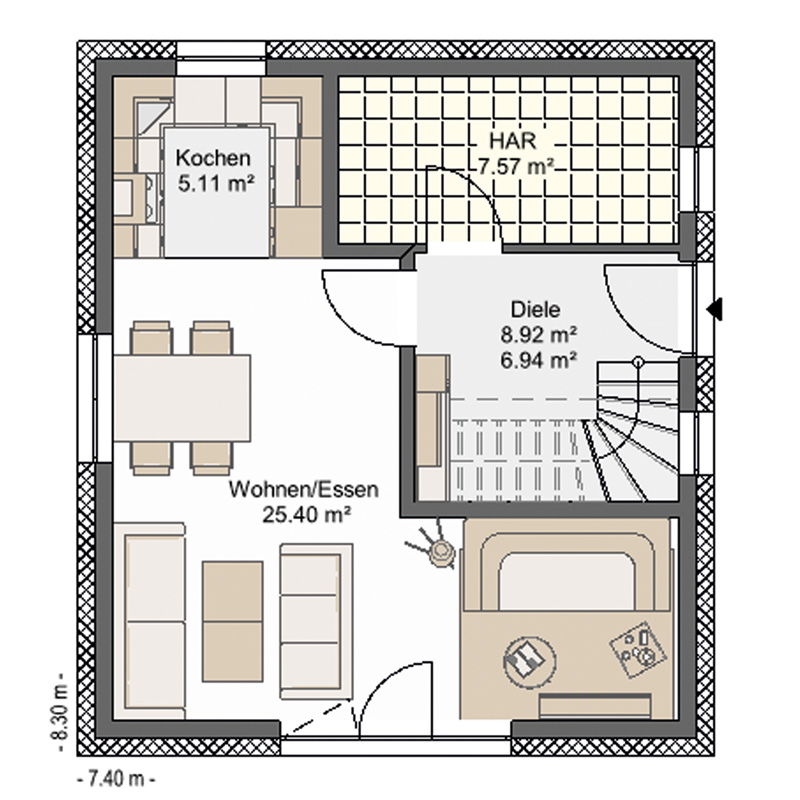 | Außenmaße: | 7,40 x 8,30 m |