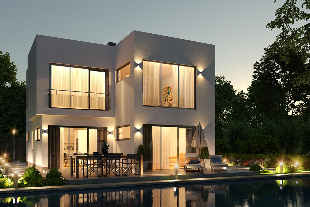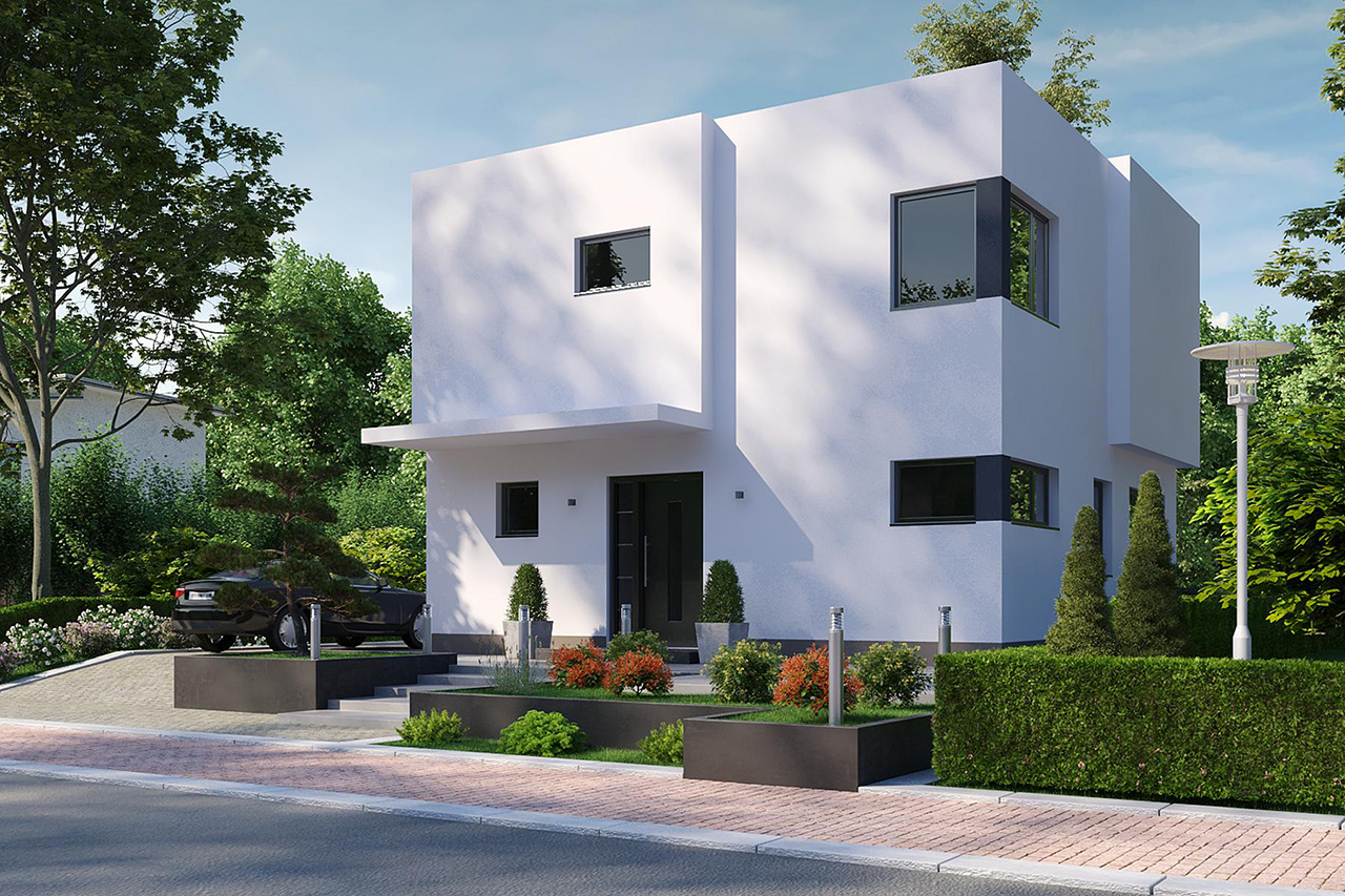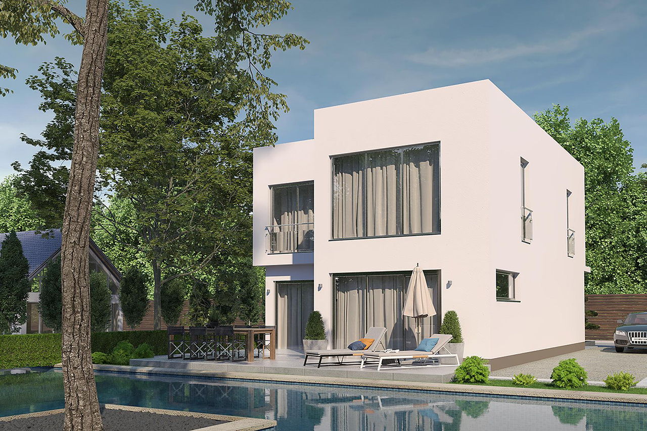 Große Glasflächen, die für viel Tageslicht in den Wohnräumen sorgen und eine moderne, kubische Optik, die ihresgleichen sucht, machen dieses Einfamilienhaus mit einer Wohnfläche von 126 m2 zu einem echten Hingucker.