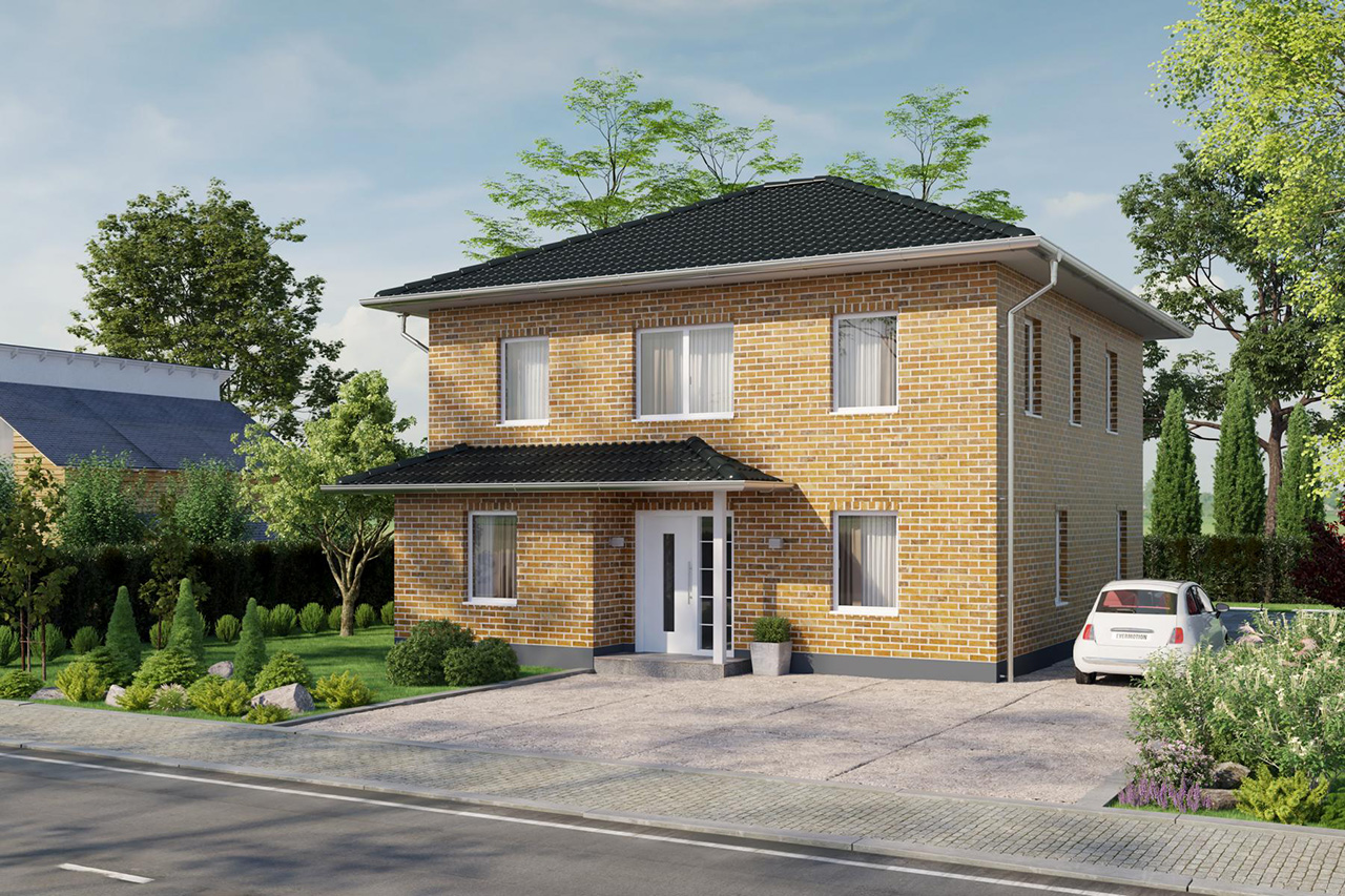 Bei dieser modernen Stadtvilla sind Ihnen in puncto Außengestaltung kaum Grenzen gesetzt. Ganz besonders ansprechend wirkt sie mit einer Fassade aus Klinker. Die Kombination aus der dunklen Dacheindeckung, dem Klinkerputz und der Überdachung des Eingangsbereiches wirkt sehr edel. Designelemente, wie große – beispielsweise auch bodentiefe – Fenster, geben der Stadtvilla zusätzlich einen modernen Touch.