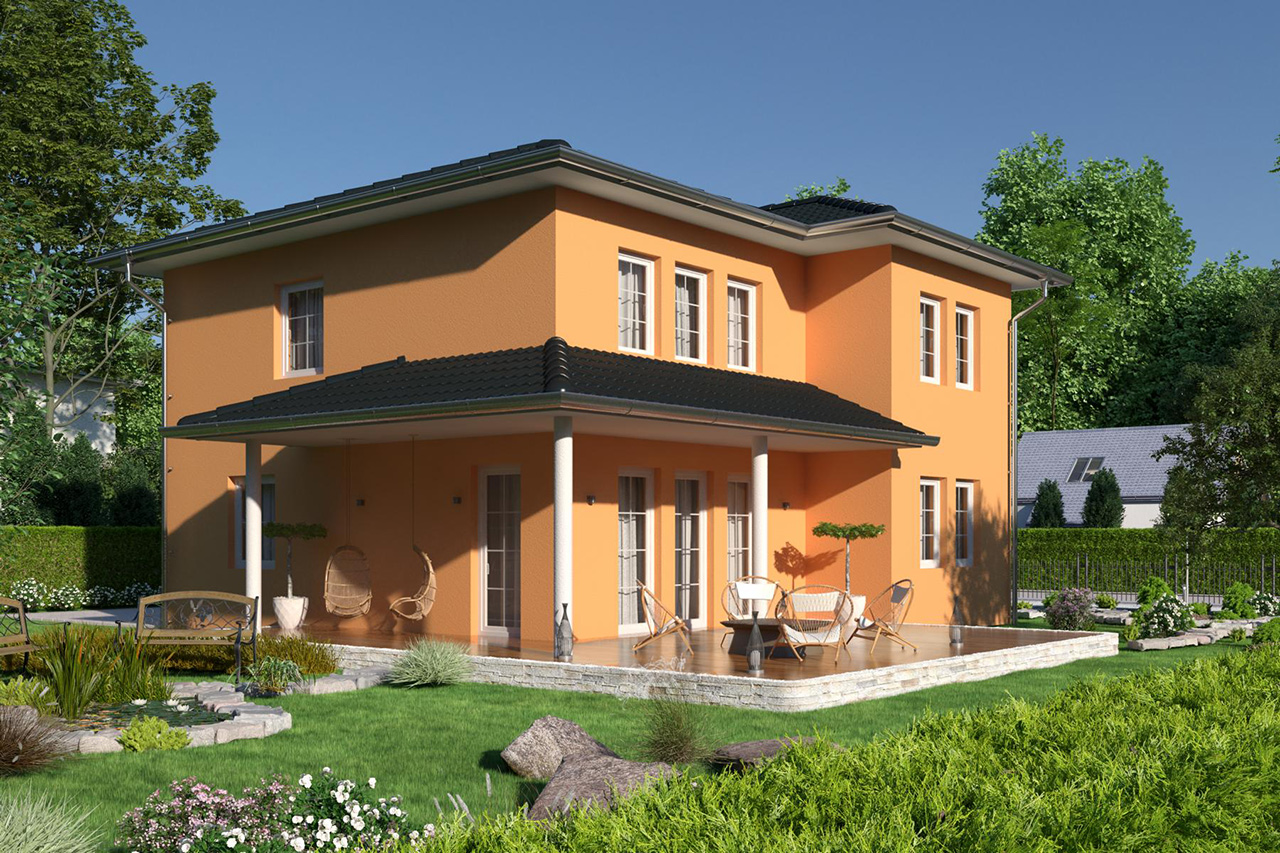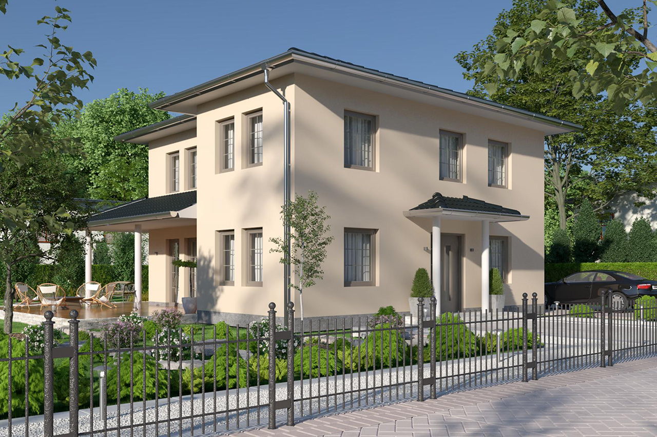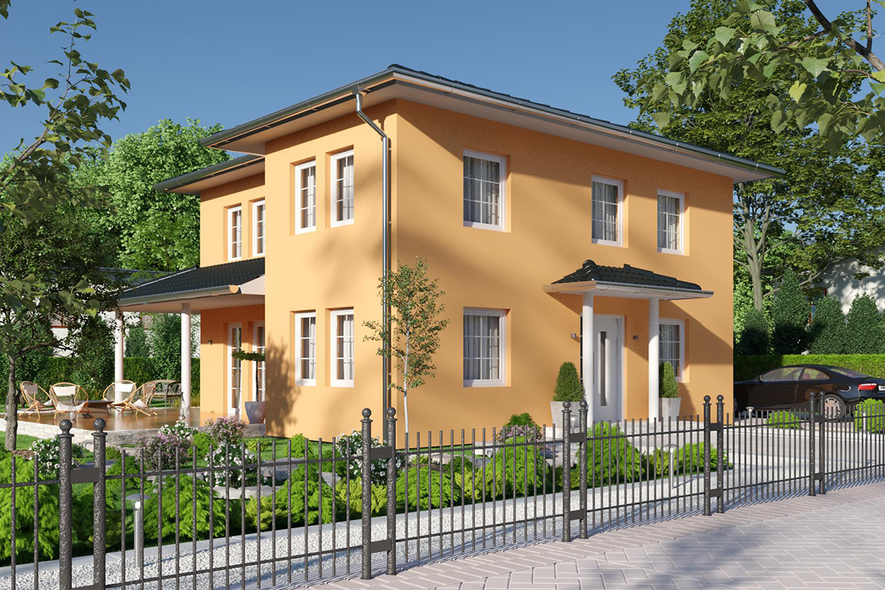 Leben wie im Urlaub – das ist das Motto dieser Stadtvilla mit einer Wohnfläche von 146 m². Warum? Weil der mediterrane Stil an ein Ferienhäuschen im sonnigen Süden erinnert und die gemütliche Veranda mit großzügiger Überdachung den perfekten Platz für köstliche Grillabende bietet. Die großen Glaselemente lassen viel Licht ins Innere des Hauses fließen. Die ausgeklügelte Raumaufteilung hält Platz für die gesamte Familie bereit. Ideale Voraussetzungen, um sich im und vor dem Haus wohlzufühlen. Eben genau wie im Urlaub.