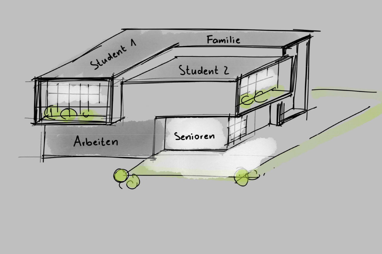 Die Aufgabe dabei war die Entwicklung eines Wohnkonzeptes für 4 bis 6 Mietparteien unter Berücksichtigung der Kriterien Rückzugsmöglichkeiten, Mehrwert durch Gemeinschaftsflächen, flexible Grundrissgestaltung, Barrierefreiheit, Anwendbarkeit auf verschiedene Altersgruppen und Wohnsituationen sowie Eignung als Investitionsobjekt.