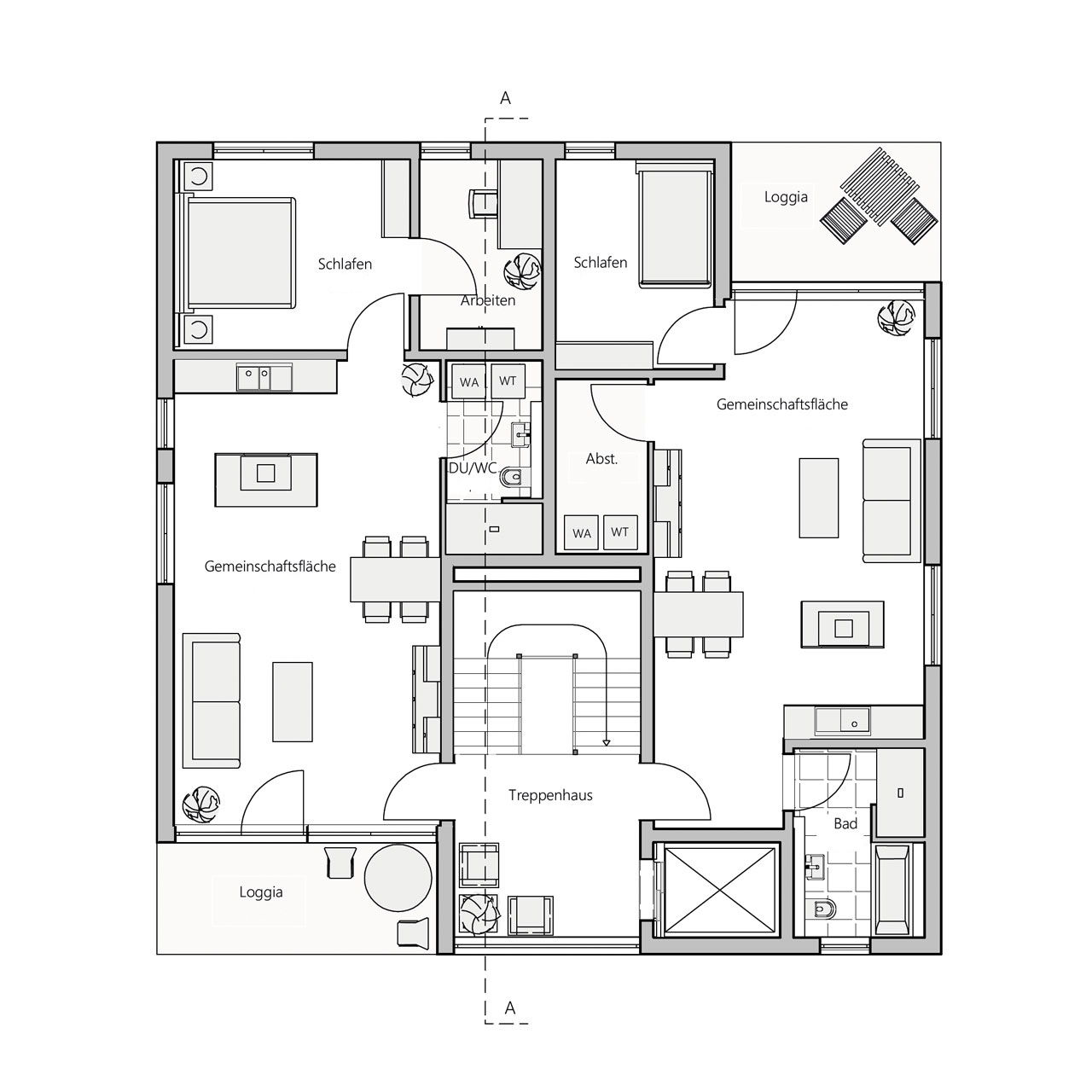 Das zentrale, lichtdurchströmte Treppenhaus bietet durch großzügige Ausführung den Bewohnern Begegnungsflächen auf jeder Ebene. Direkt neben dem Eingang liegt der Technikraum, indem die Mieter zusätzlich die Möglichkeit haben, ihre Wäsche zu waschen und dieser somit als Gemeinschaftsraum und Treffmöglichkeit genutzt werden kann.