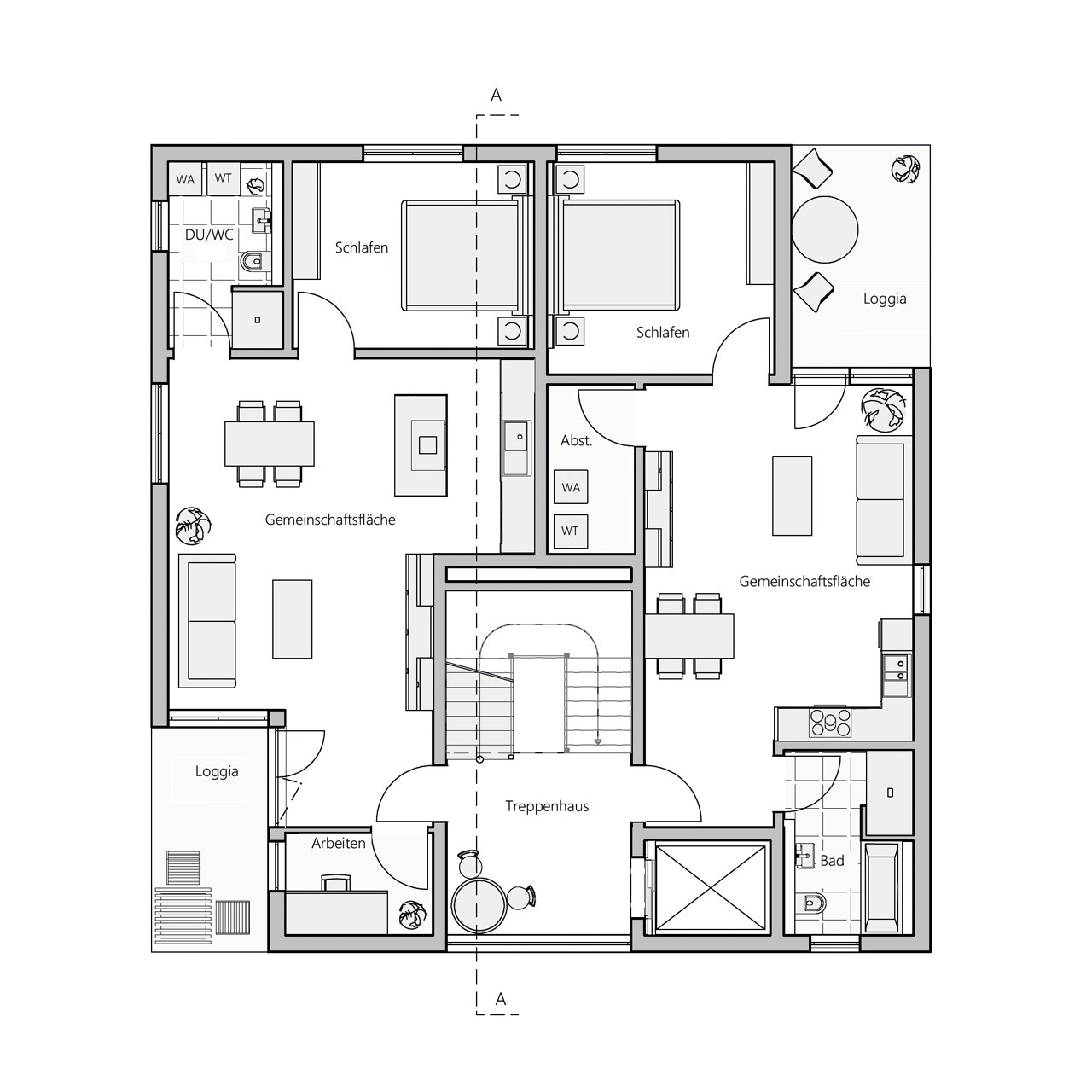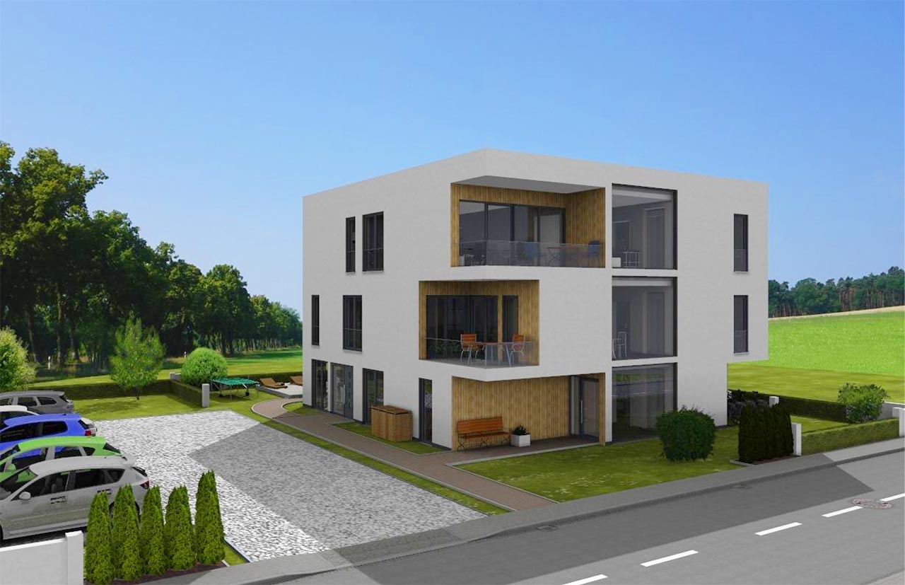 Der Grundbaustein unseres Projektes besteht aus einem Mehrfamilienhaus mit drei Geschossen für insgesamt sechs Mietparteien, wobei pro Etage zwei Wohnungen eingeplant sind.