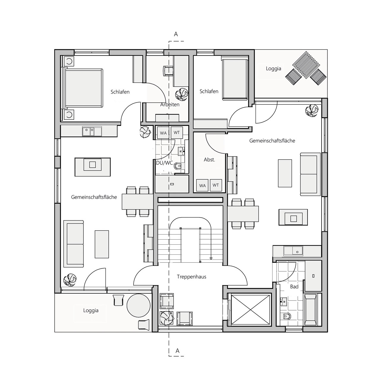 Die Entwurfsaufgabe lag darin, ein Wohnkonzept eines Mehrfamilienhauses mit vier bis sechs Wohnparteien zu entwickeln. Dieses sollte Wohnbereiche für persönliche Rückzugsmöglichkeiten, sowie Gemeinschaftsflächen für den Mehrwert des verbundenen Wohnens bieten.