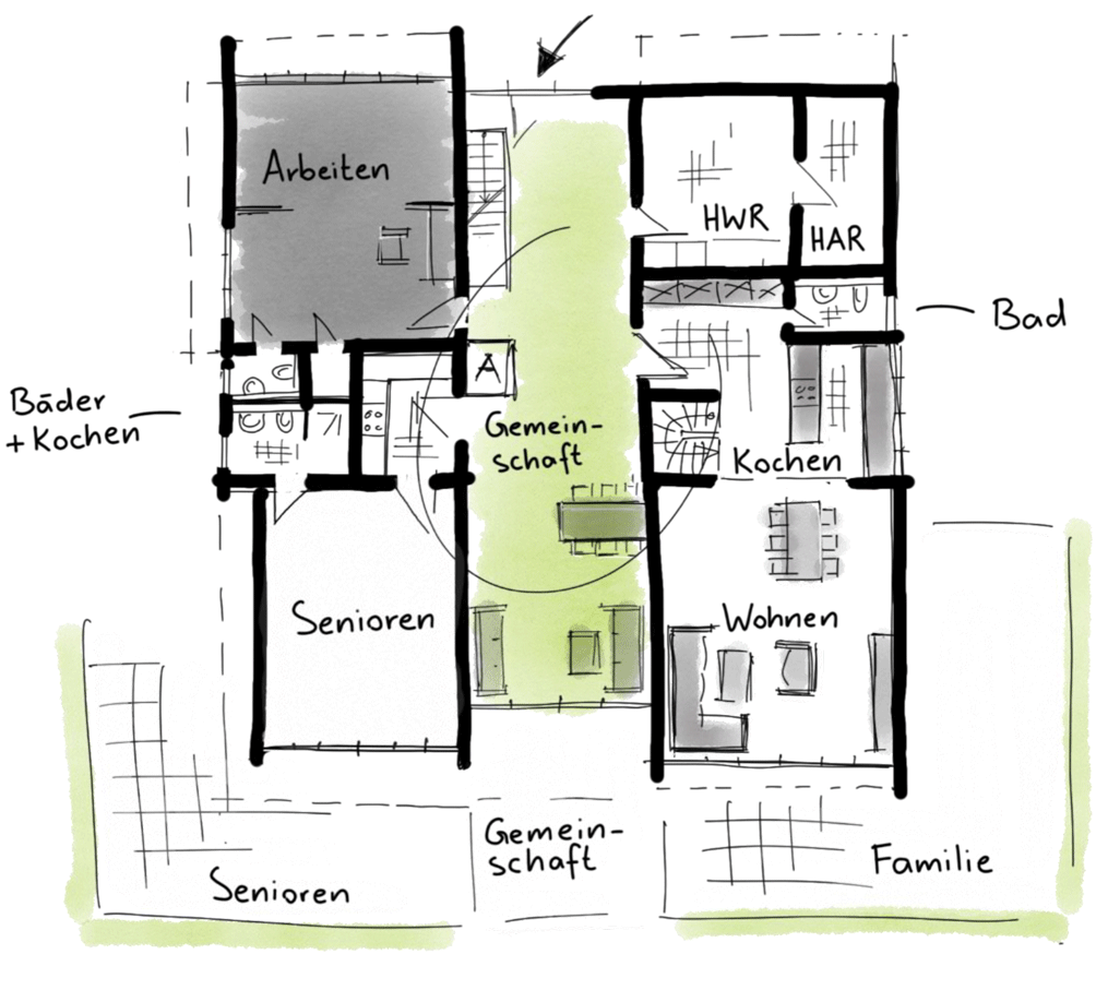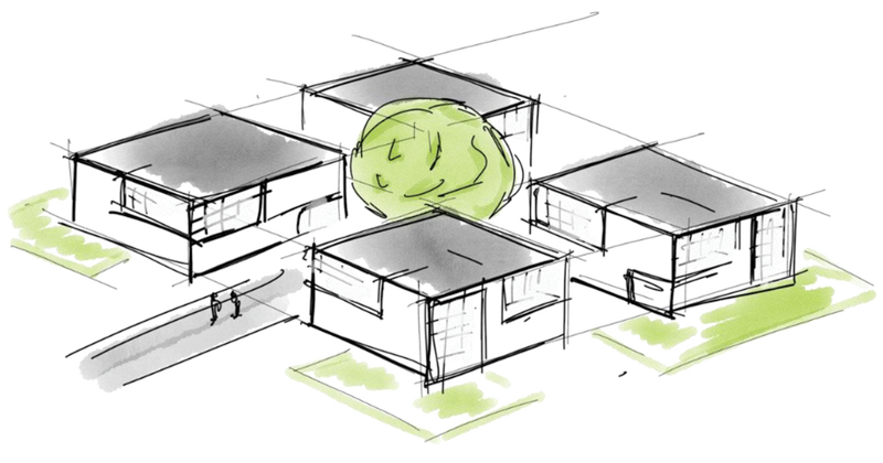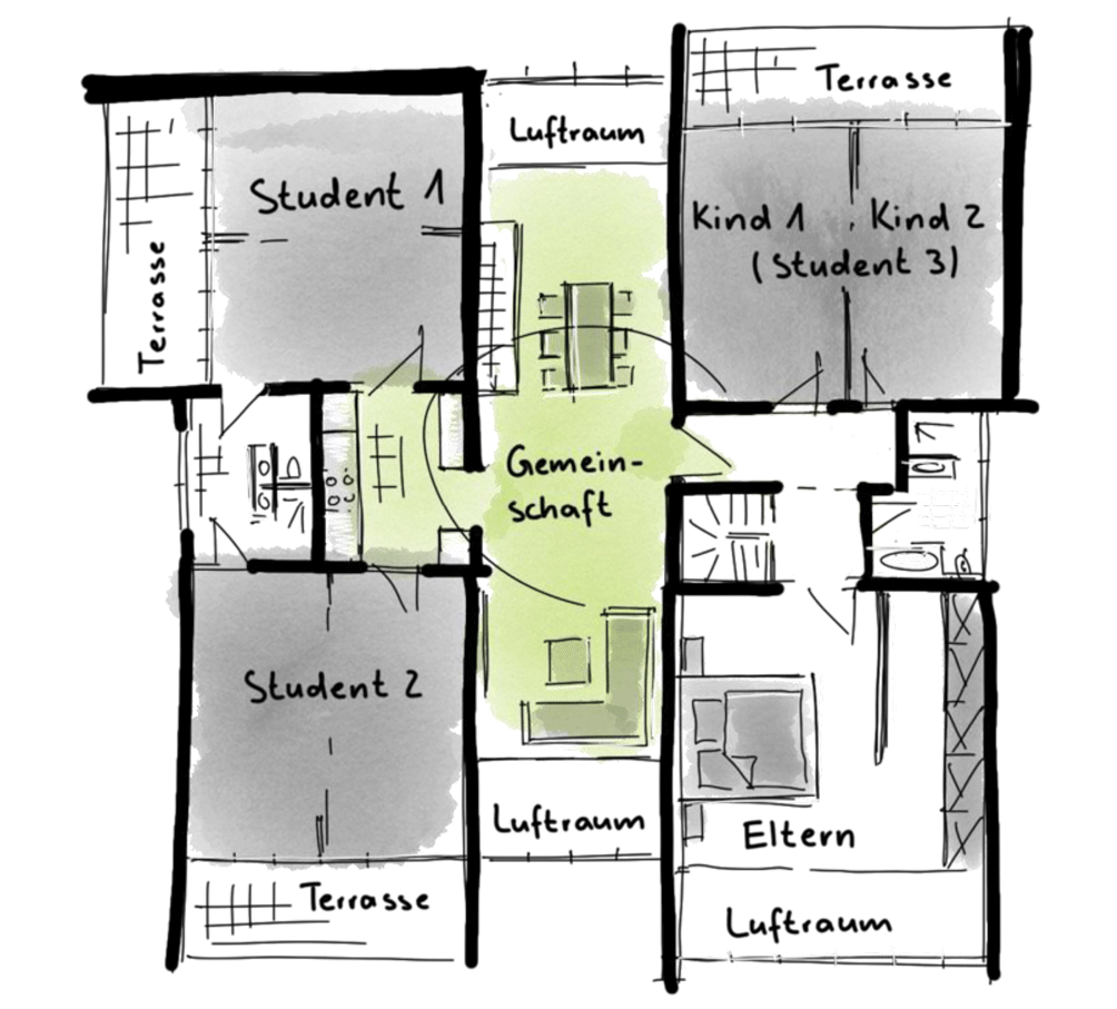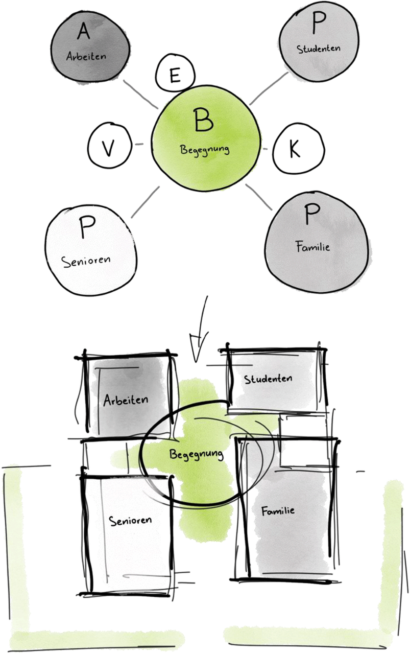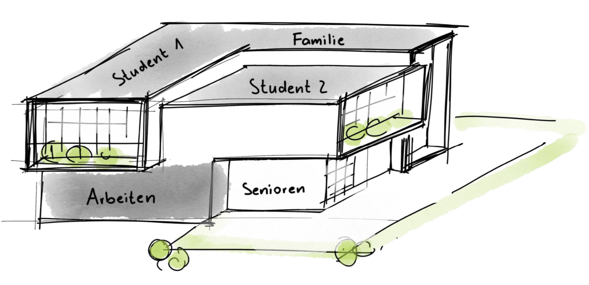Der Gedanke der Verbindung zwischen privaten Räumen und Begegnung lässt sich ferner auf eine Verbindung mehrerer Gebäude übertragen.