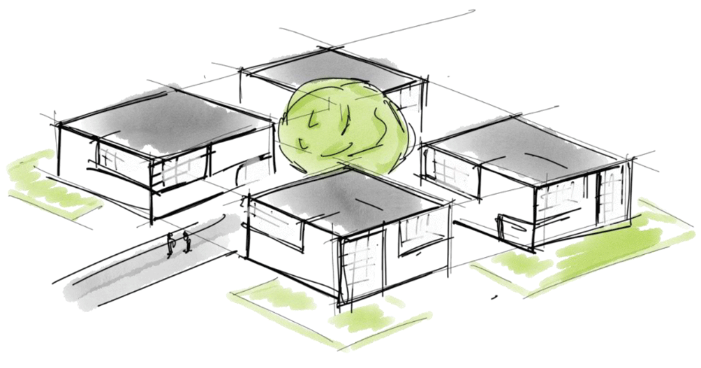 Jeweils vier untereinander gespiegelte Gebäude bilden dabei in derer Mitte einen Freiraum, der als Begegnungsstätte dient, hier ein kleiner Platz mit einem Baum, der allen Bewohnern zur individuellen Nutzung zur Verfügung steht. Auf diese Weise wird auch den Bewohnern ohne private Gartenanlage ein Rückzugsort im Freien geboten.