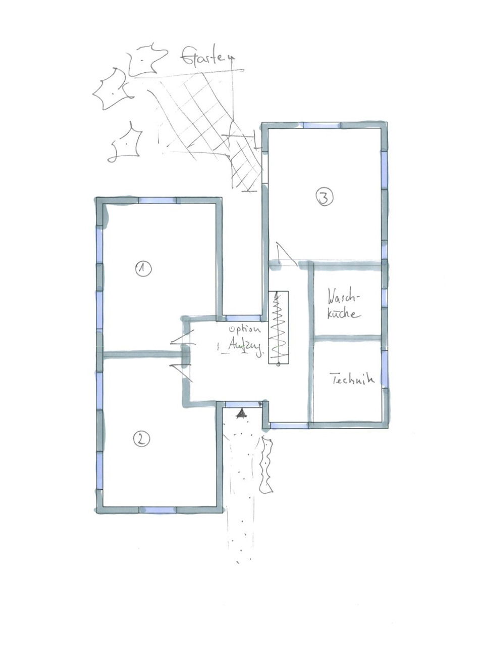 - ein Zwischenbereich für den Eingang und Treppenhaus bzw. ggf. z. B. Fahrstuhl