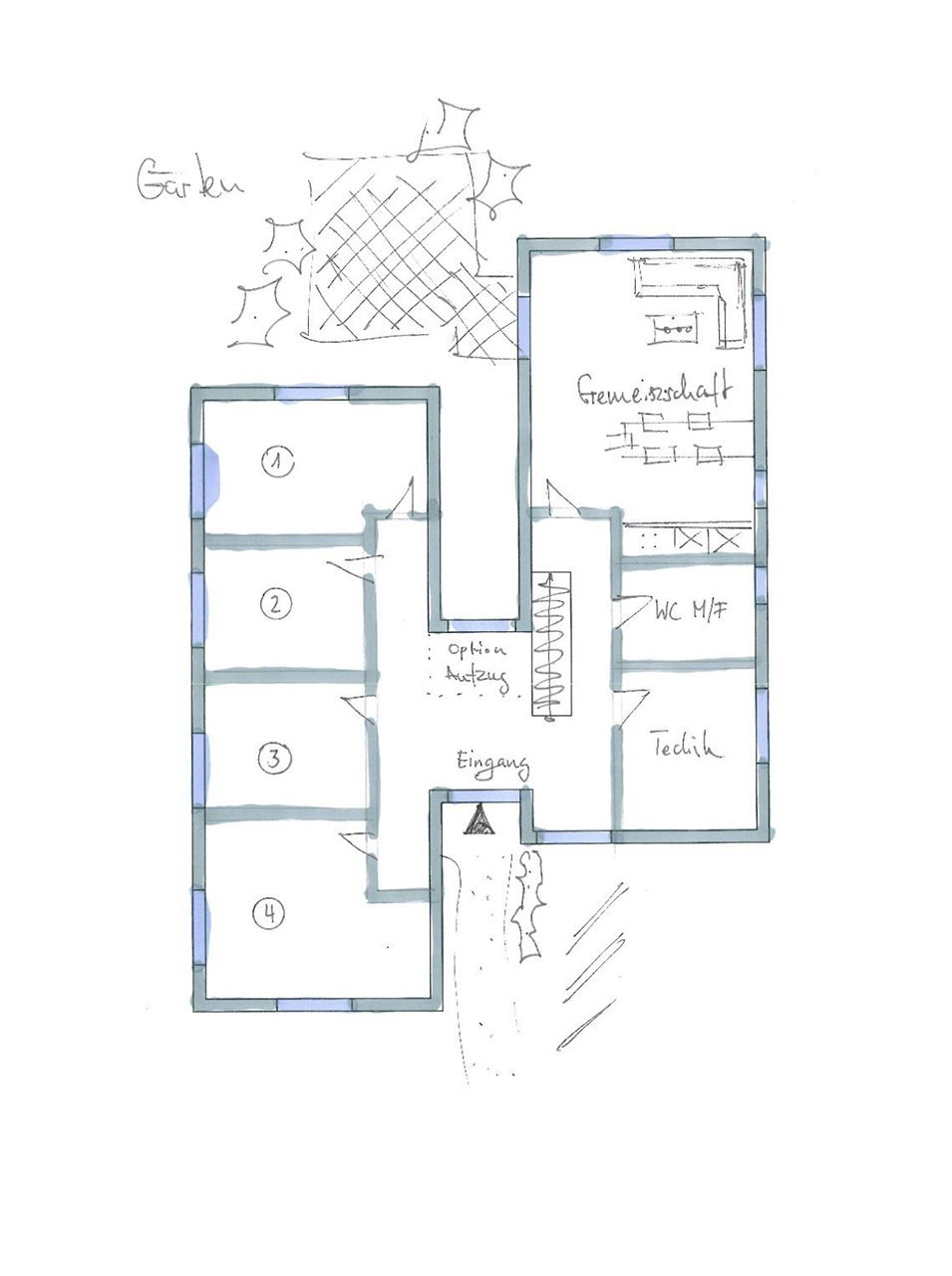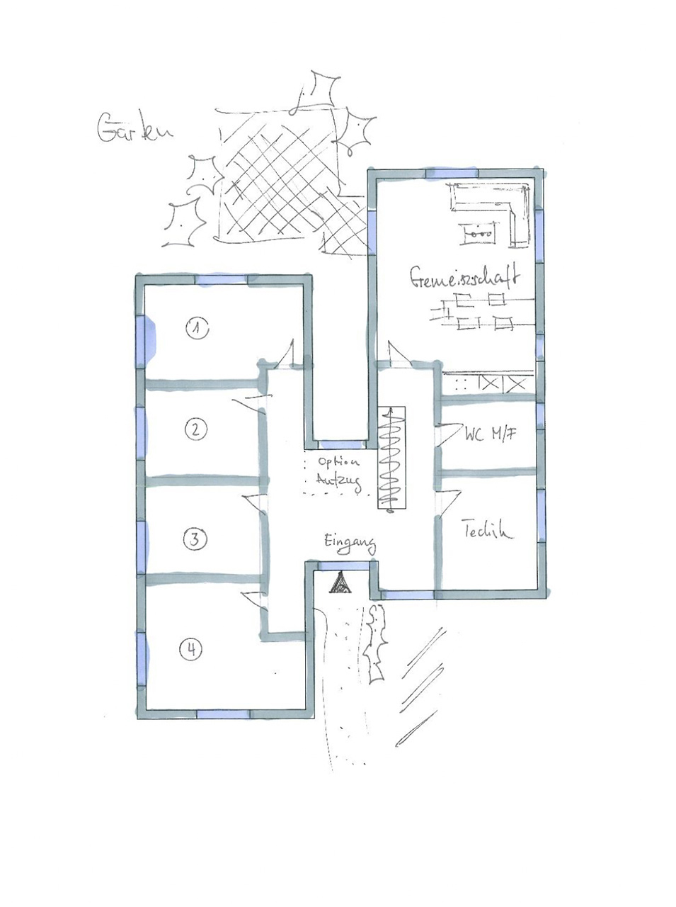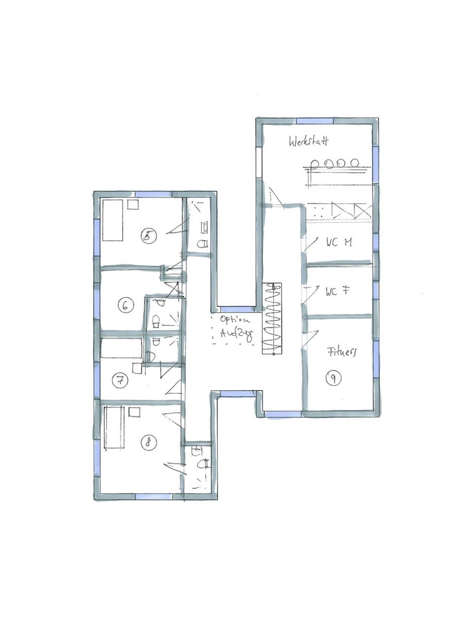 - der zweite Baukörper für persönliche Rückzugsmöglichkeiten und Gemeinschaftsräume → ggf. z. B. auch Fitnessraum