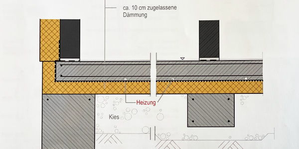 - Die Bodenplatte isoliert, wirkt als Energiespeicher und gibt Wärme in den Wohnraum ab