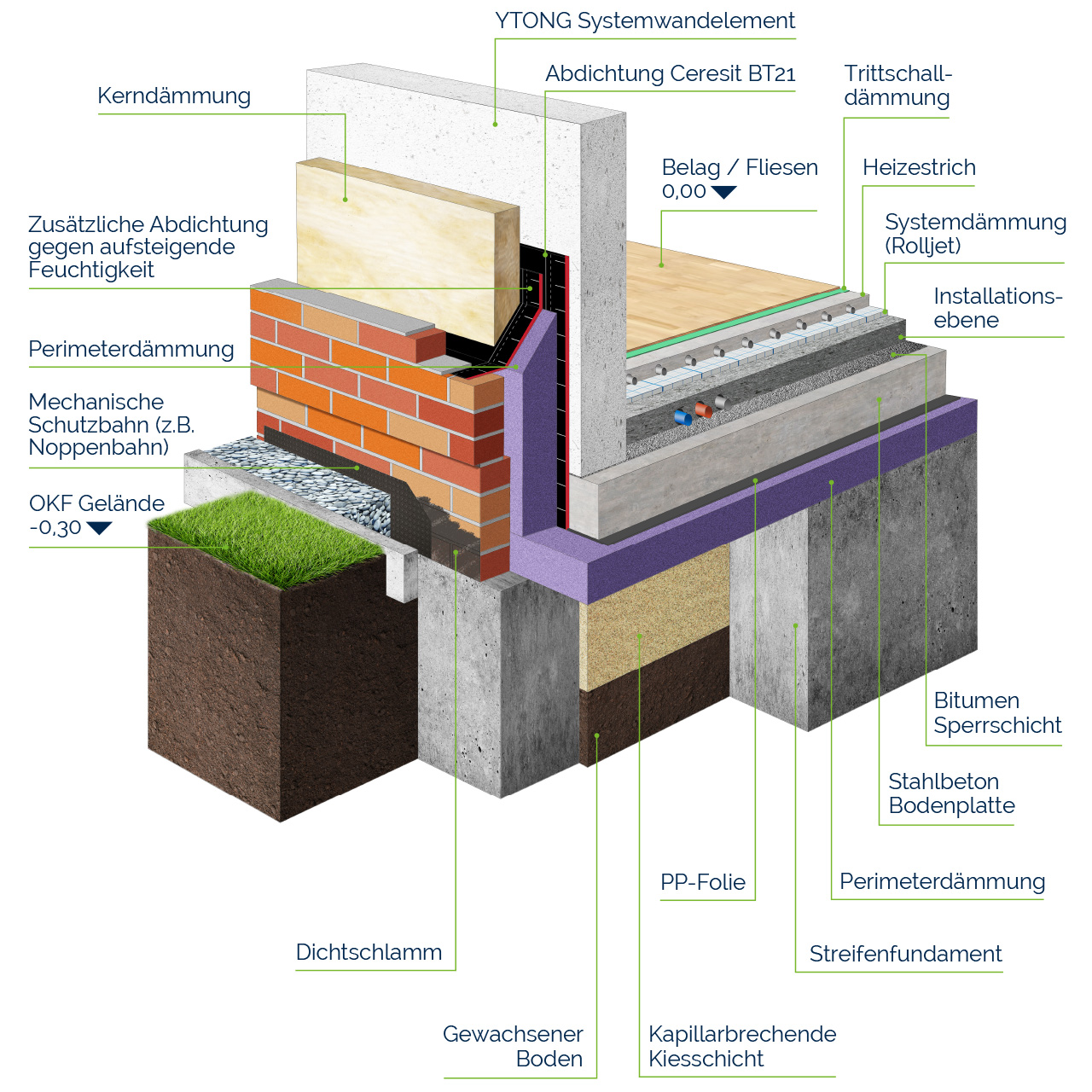- Die Bodenplatte isoliert, wirkt als Energiespeicher und gibt Wärme in den Wohnraum ab