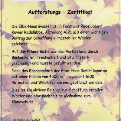 Zum 25-jährigen Elbe-Haus® Firmenjubiläum wurden alle geladenen Gäste im Sinne der Nachhaltigkeit darum gebeten, auf Geschenke zu verzichten und stattdessen lieber die Aufforstung eines Waldstückes in der Nähe von Schwerin zu unterstützen.