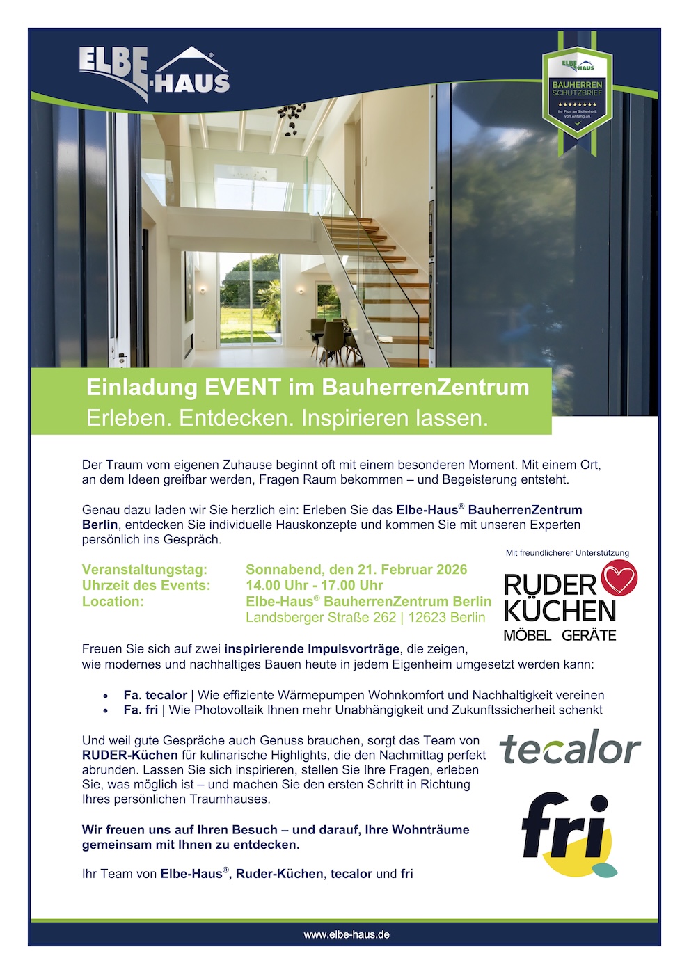 Der Traum vom eigenen Zuhause beginnt oft mit einem besonderen Moment. Mit einem Ort, an dem Ideen greifbar werden, Fragen Raum bekommen – und Begeisterung entsteht. Genau dazu laden wir Sie herzlich ein: Erleben Sie das Elbe-Haus® BauherrenZentrum Berlin, entdecken Sie individuelle Hauskonzepte und kommen Sie mit unseren Experten persönlich ins Gespräch.